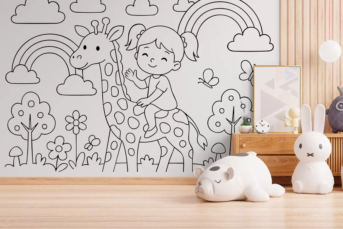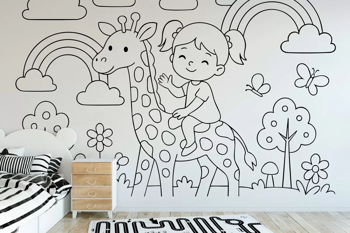 Papier peint dessin en noir et blanc d'une fille sur une girafe dans le style d'un livre de coloriage pour enfants N° w04753