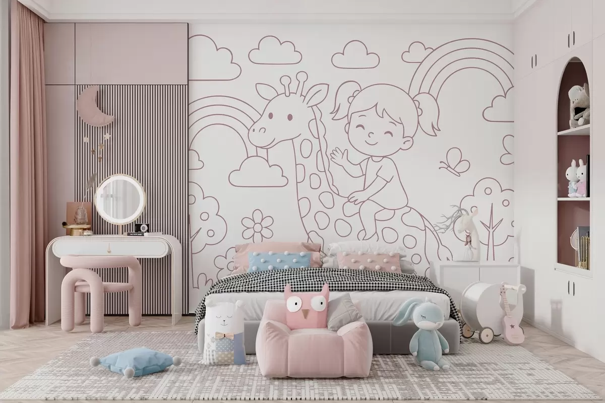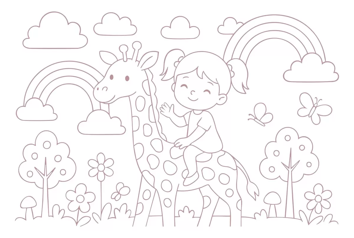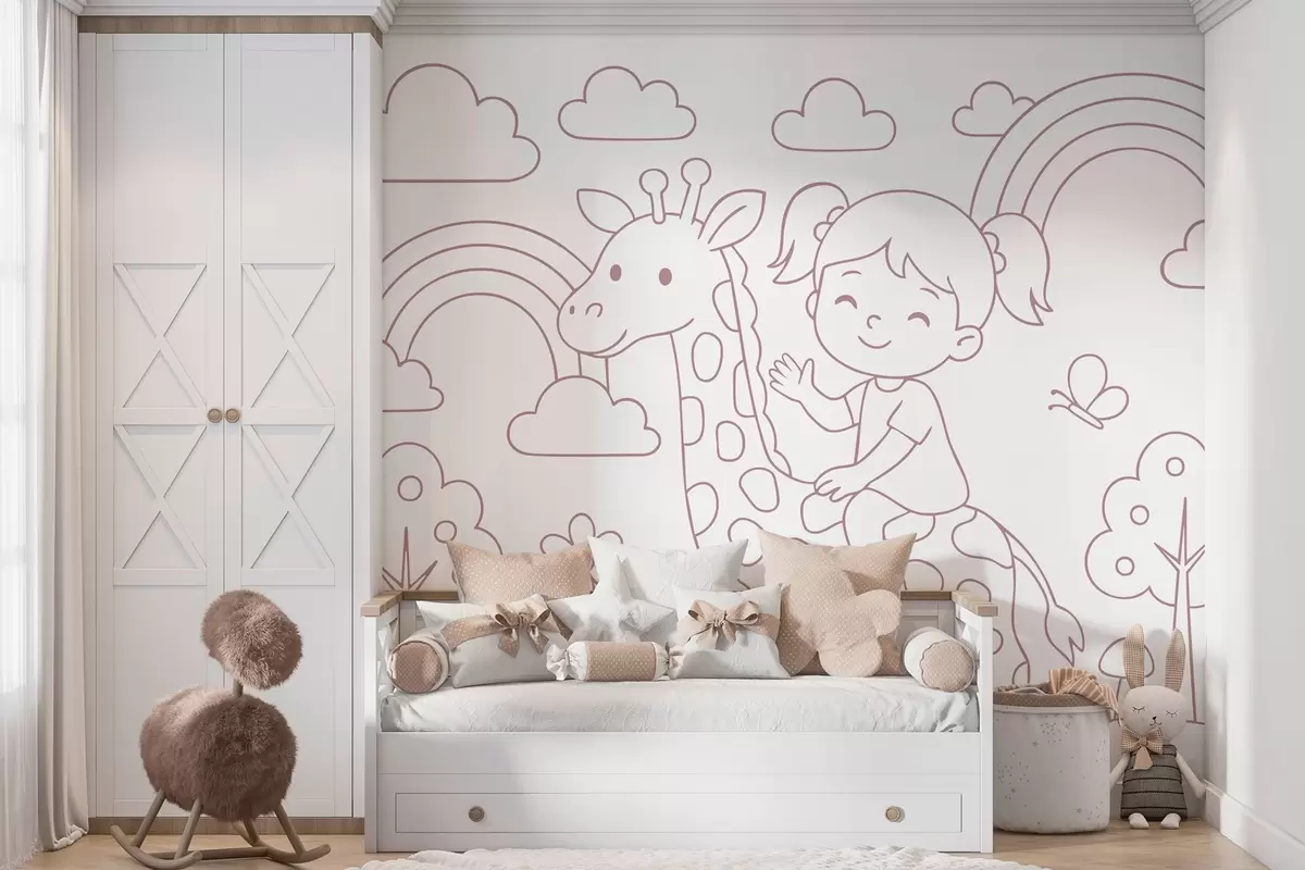 Papier peint peinture à la poudre représentant une fille sur une girafe, dans le style d'un livre de coloriage pour enfants N° w04753v1