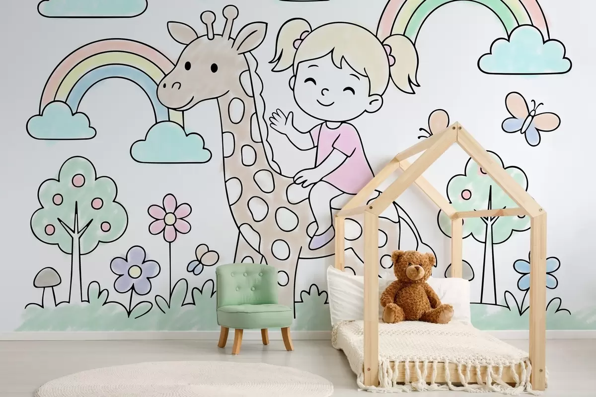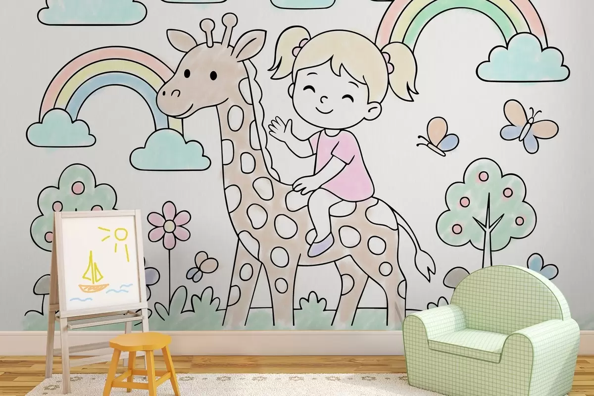 Papier peint fille sur une girafe dans le style d'un livre de coloriage pour enfants N° w04755