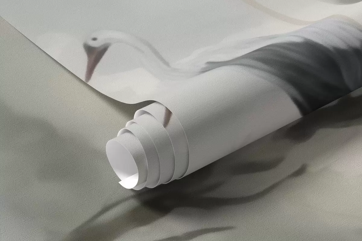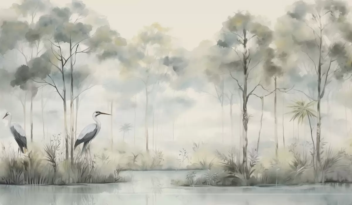 Papier peint Forêt brumeuse au bord de l'eau avec des hérons, palette douce et froide N° w04788
