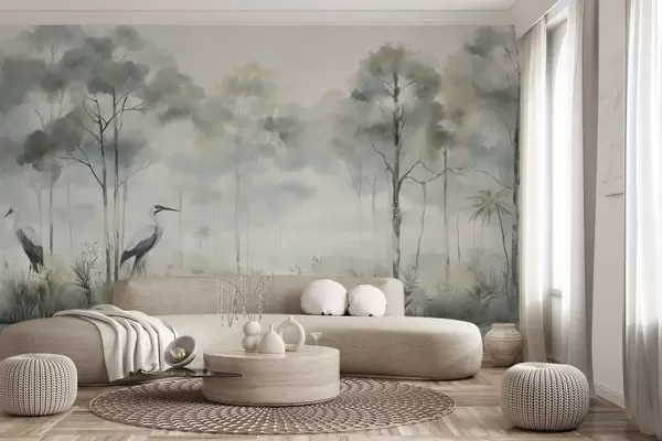 Papier peint Forêt brumeuse au bord de l'eau avec des hérons, palette douce et froide N° w04788