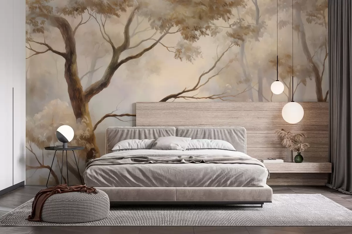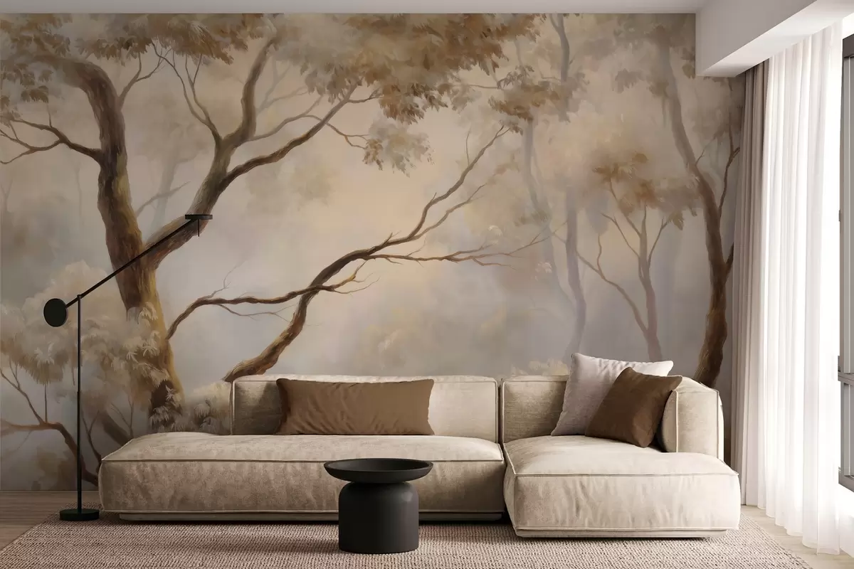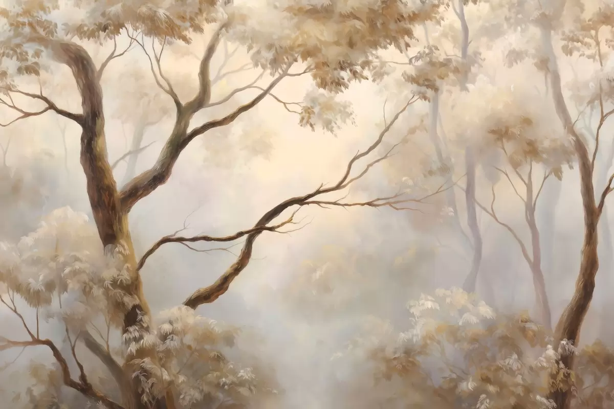 Papier peint La forêt dans la brume légère du matin. Une peinture atmosphérique délicate dans le style d'un paysage artistique. N° w04817
