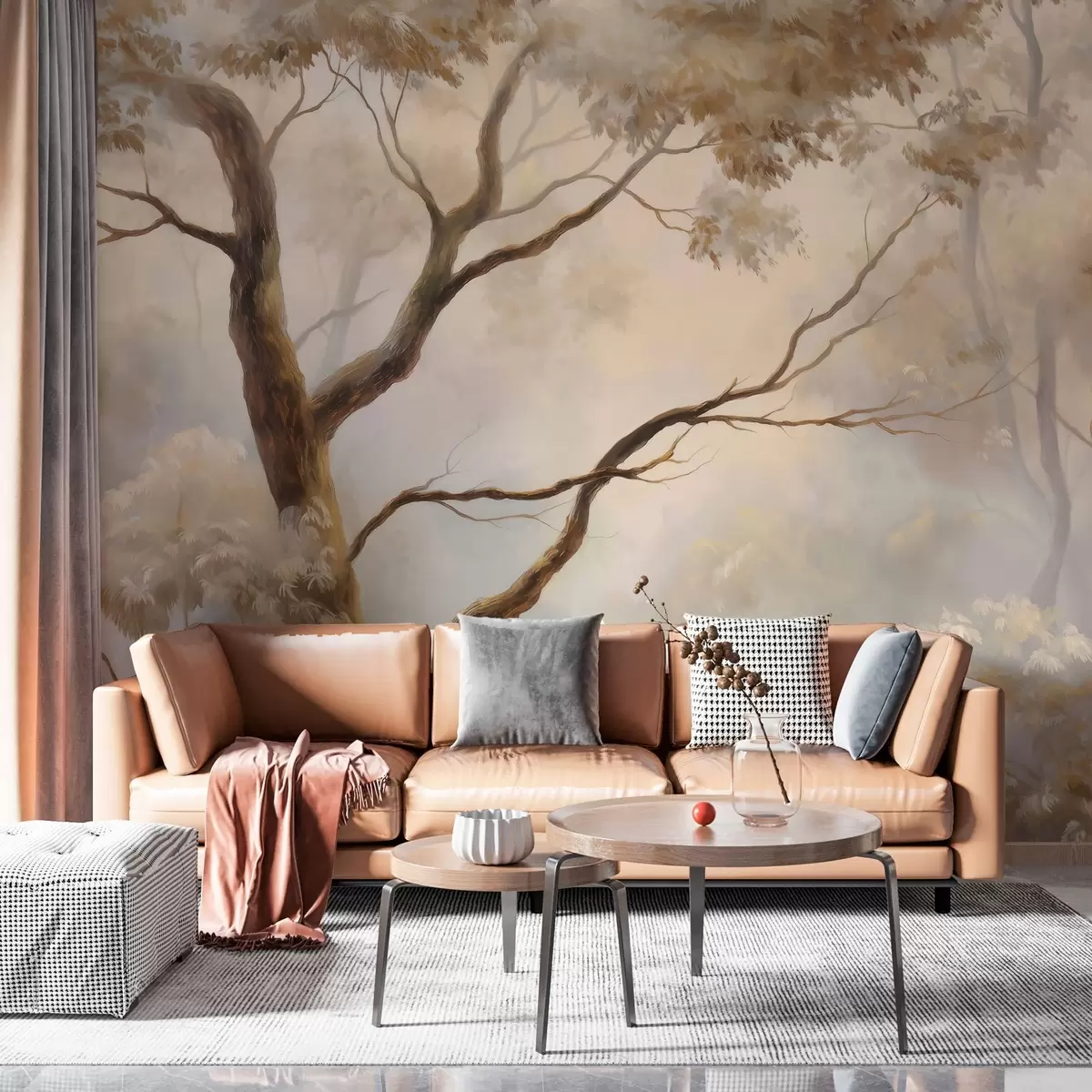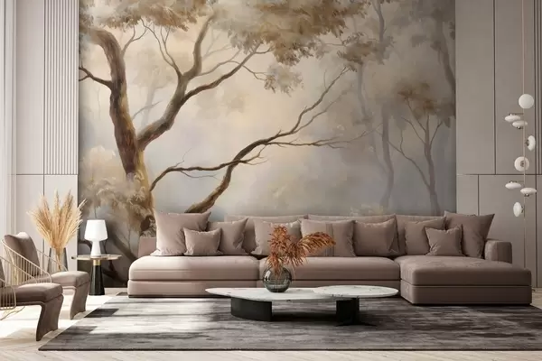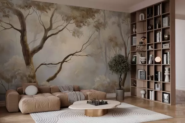 Papier peint La forêt dans la brume légère du matin. Une peinture atmosphérique délicate dans le style d'un paysage artistique. N° w04817