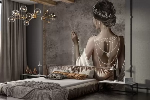 Papier peint Femme vue de dos avec des perles, fond gris à motifs de pierres N° w04854