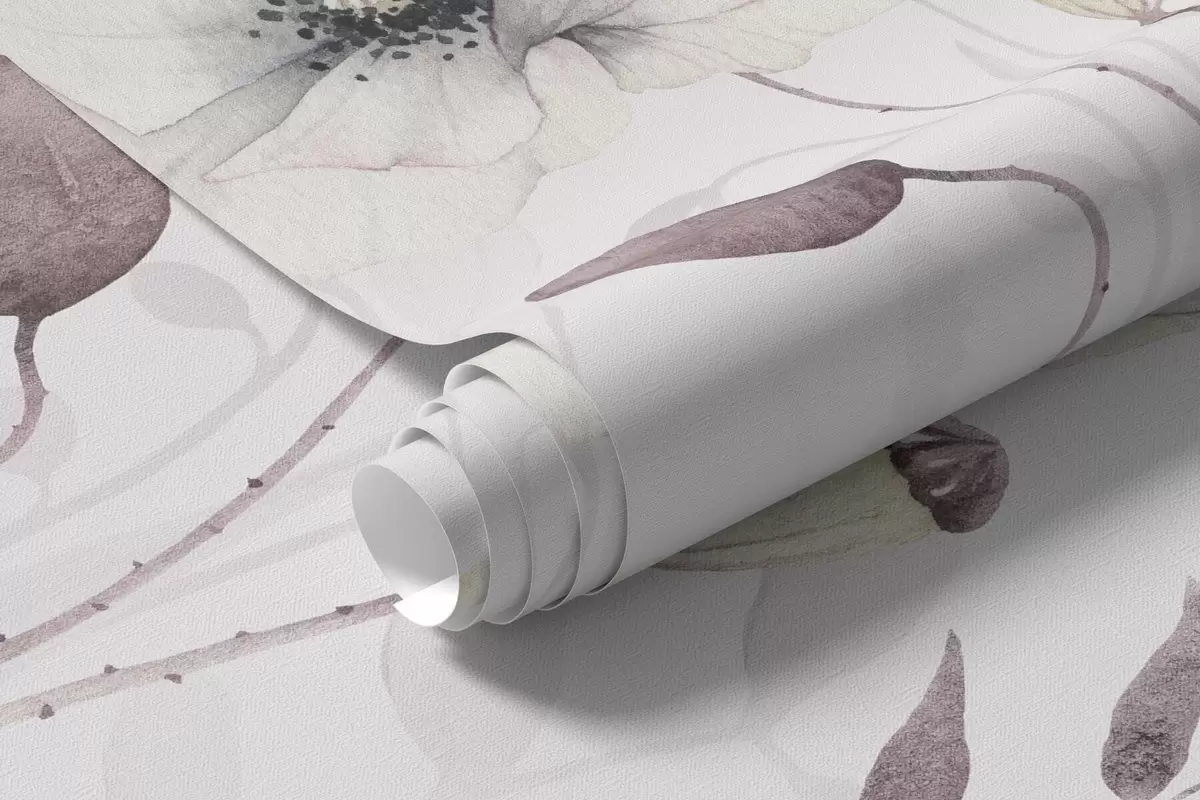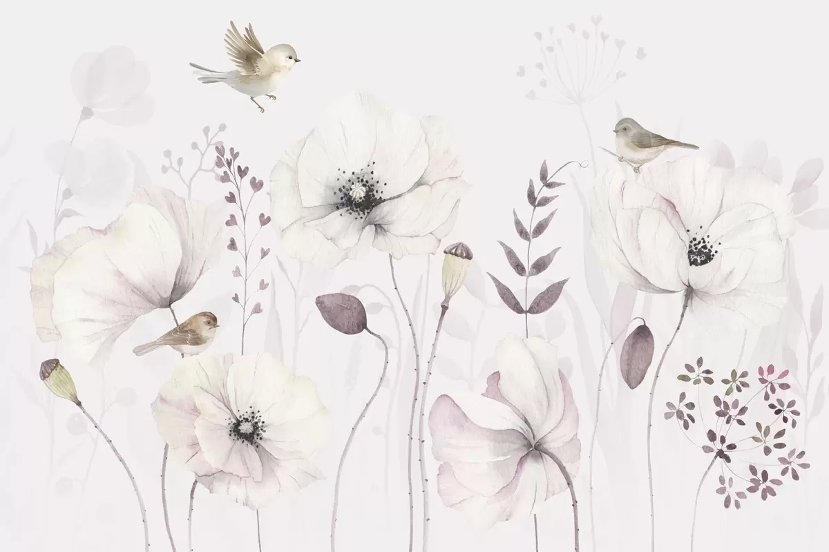 Papier peint Coquelicots aquarellés avec petits oiseaux dans un ton mauve doux N° w04861