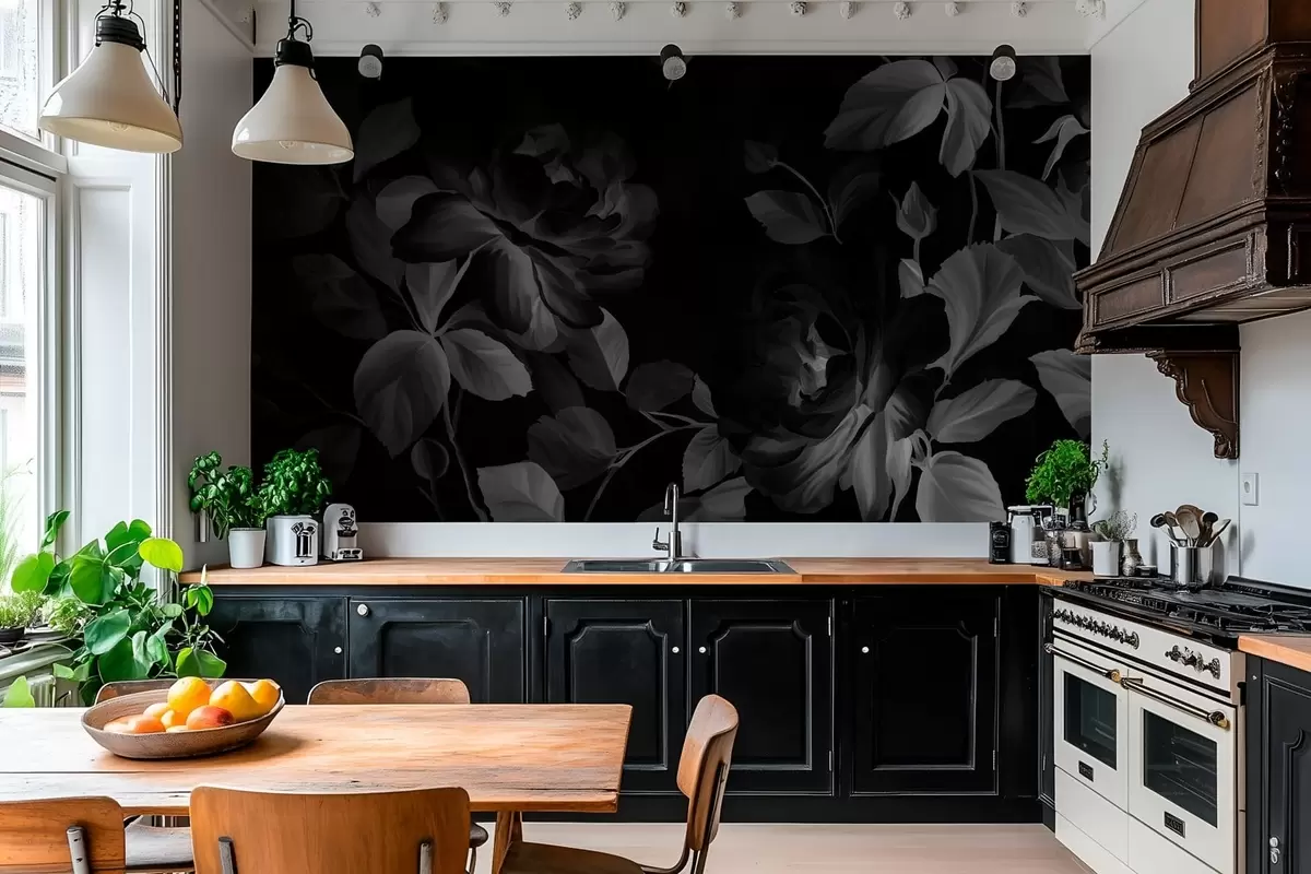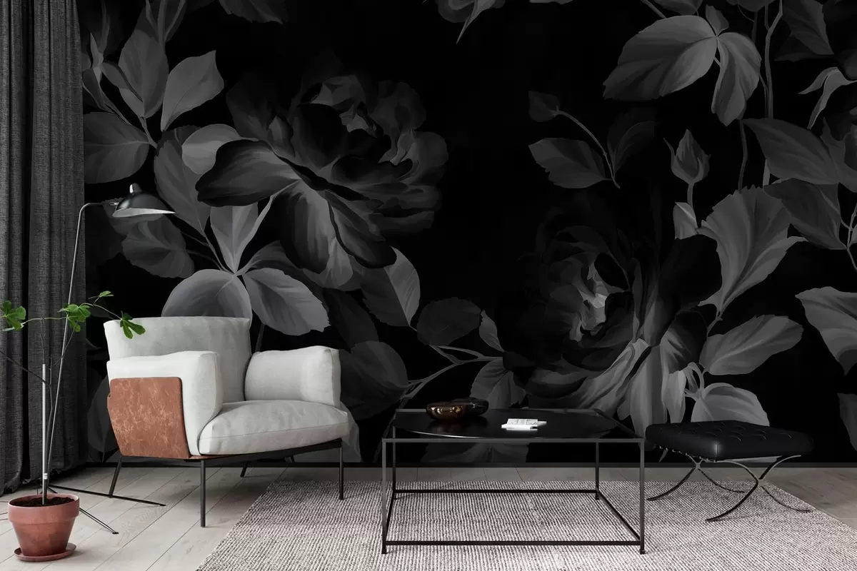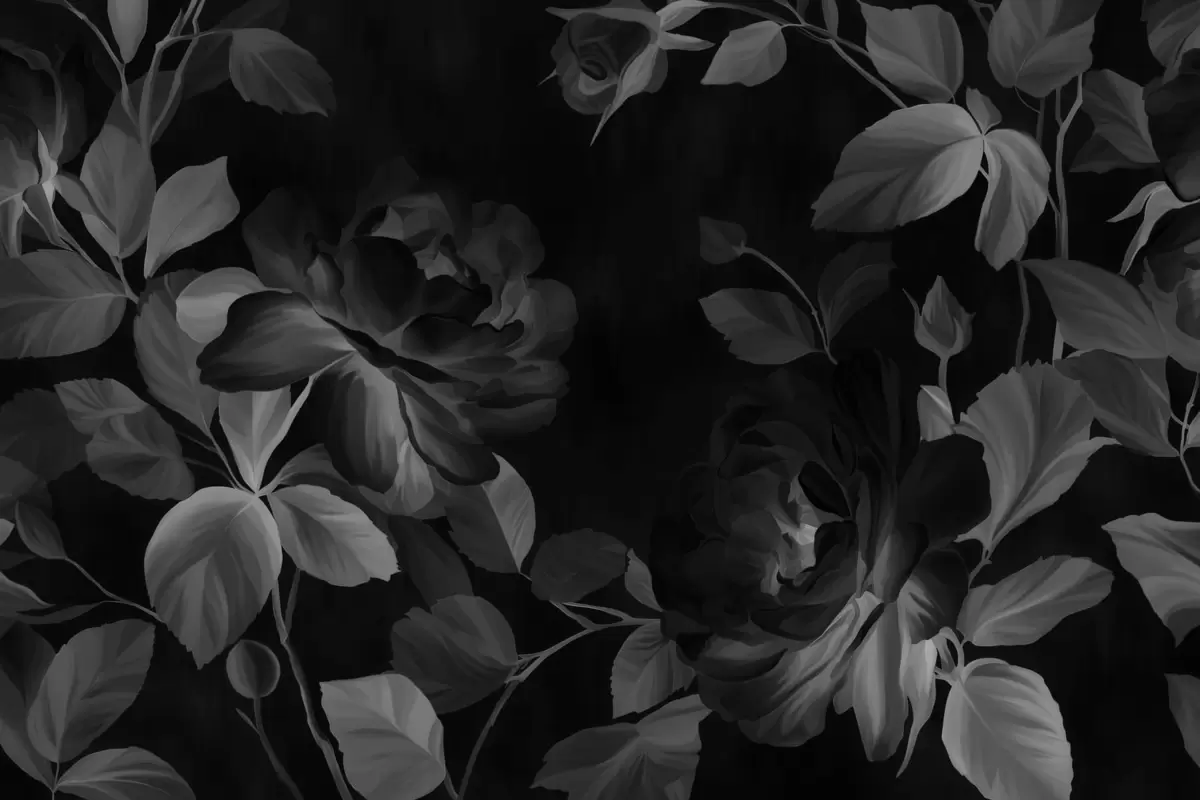 Papier peint roses pittoresques en noir et blanc dans le style de la peinture à l'huile N° w04873v1