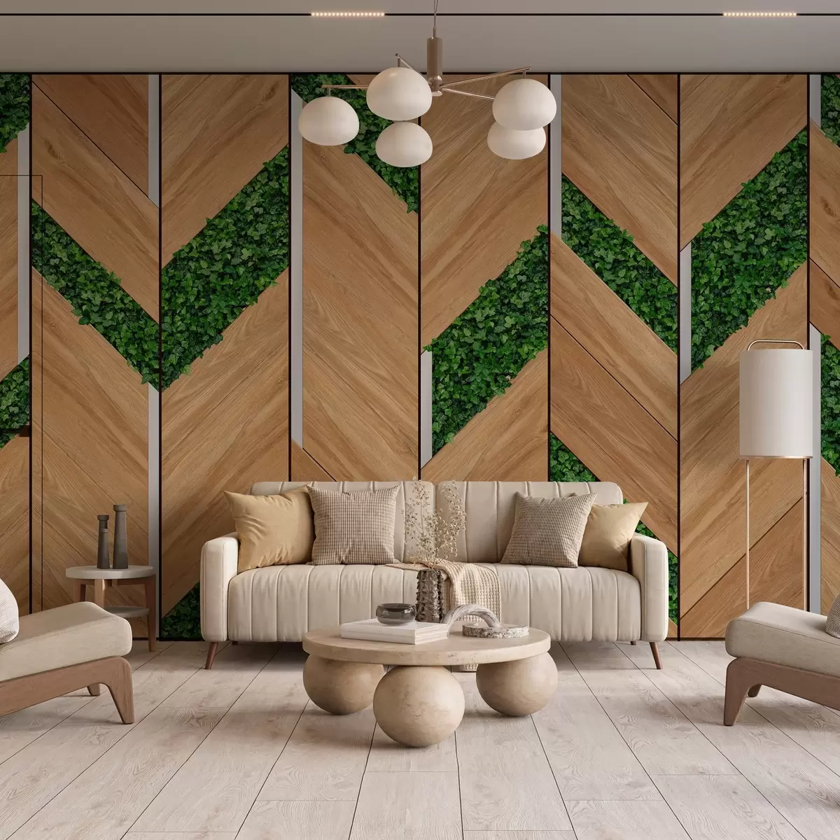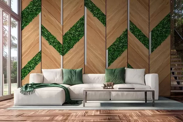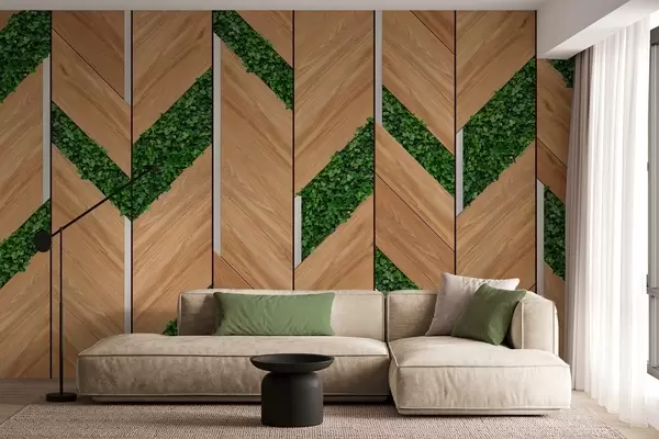 Papier peint imitation de panneaux en bois clair avec inserts végétaux N° w04875