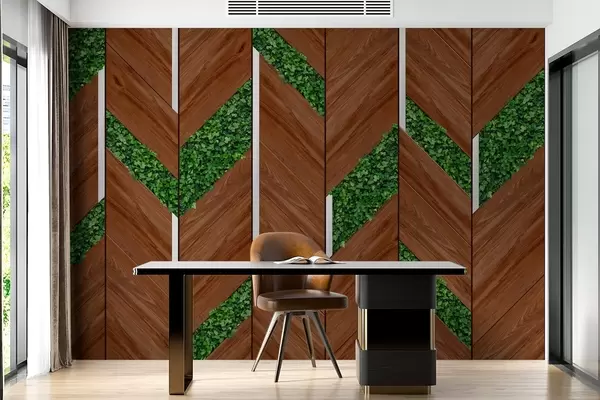 Papier peint imitation de panneaux en bois foncé avec inserts végétaux N° w04875v1