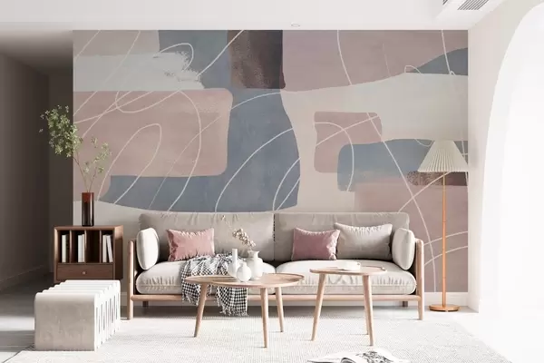 Papier peint abstraction moderne dans des tons rose poudré, gris-bleu, beige et marron N° w04877