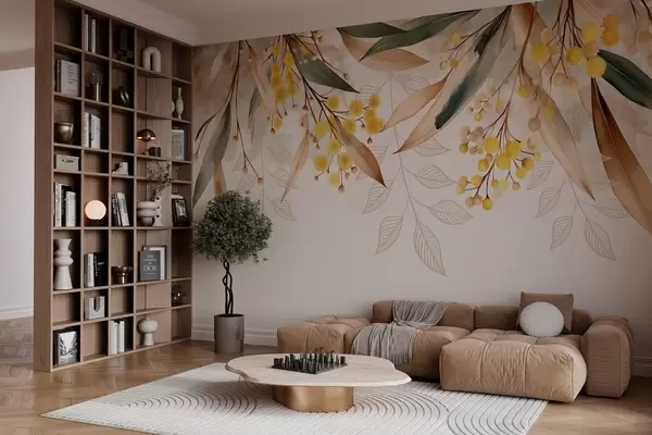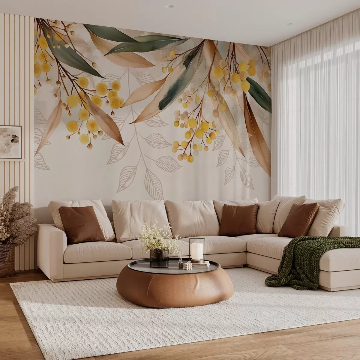 Papier peint fleurs et feuilles de mimosa tombant du ciel dans un style aquarelle N° w04880