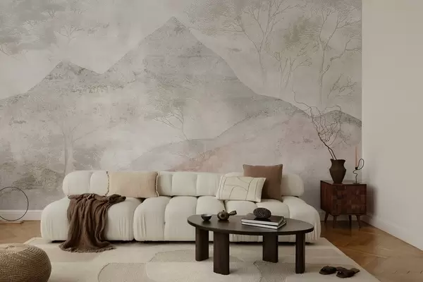 Papier peint Montagnes et arbres aux couleurs pastel dans une légère brume N° w04954