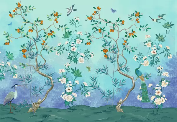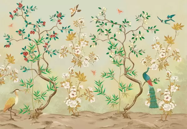 Papier peint Scène décorative avec des arbres, des fleurs et des oiseaux sur fond sombre N° w05004
