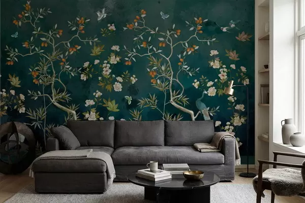 Papier peint Scène décorative avec des arbres, des fleurs et des oiseaux sur fond sombre N° w05004