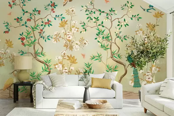 Papier peint Scène avec des arbres, des fleurs et des oiseaux, fond clair N° w05004v1