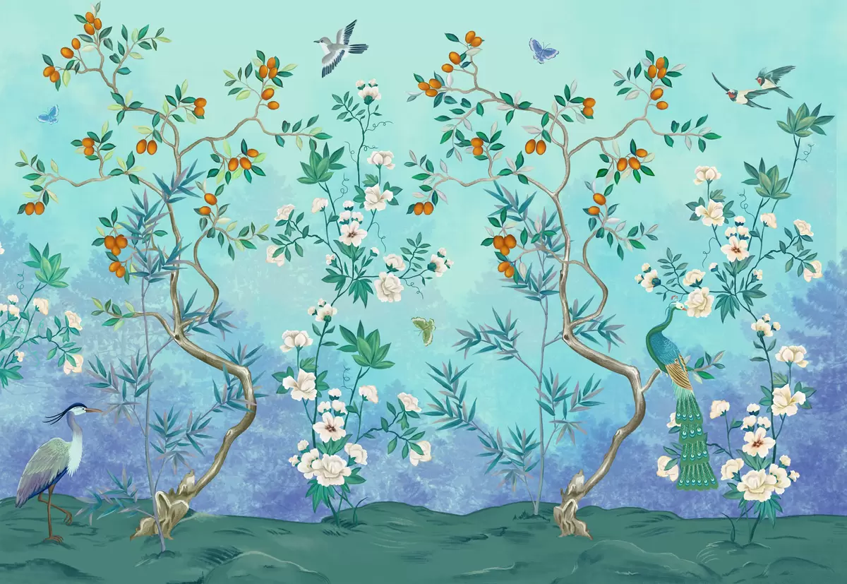 Papier peint Scène avec des arbres, des fleurs et des oiseaux, fond bleu N° w05004v2