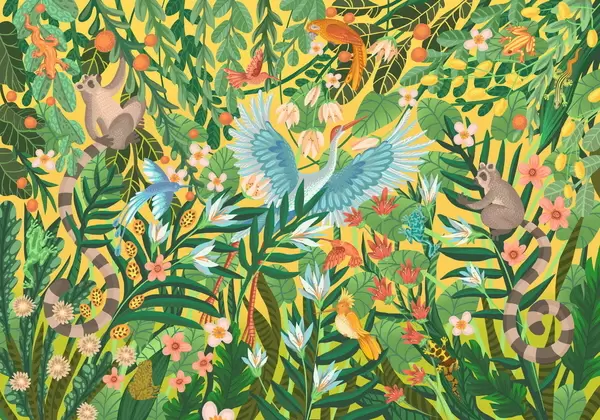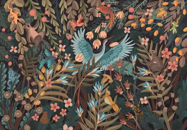 Papier peint Scène fantastique avec des oiseaux et des animaux parmi les plantes N° w05024