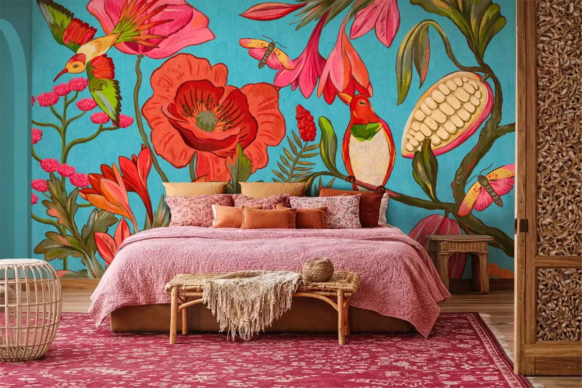 Papier peint Fleurs et oiseaux décoratifs sur fond bleu N° w05036v3