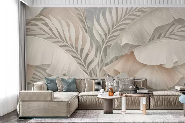 Papier peint grandes feuilles tropicales dans les tons pêche et turquoise mat N° w05062