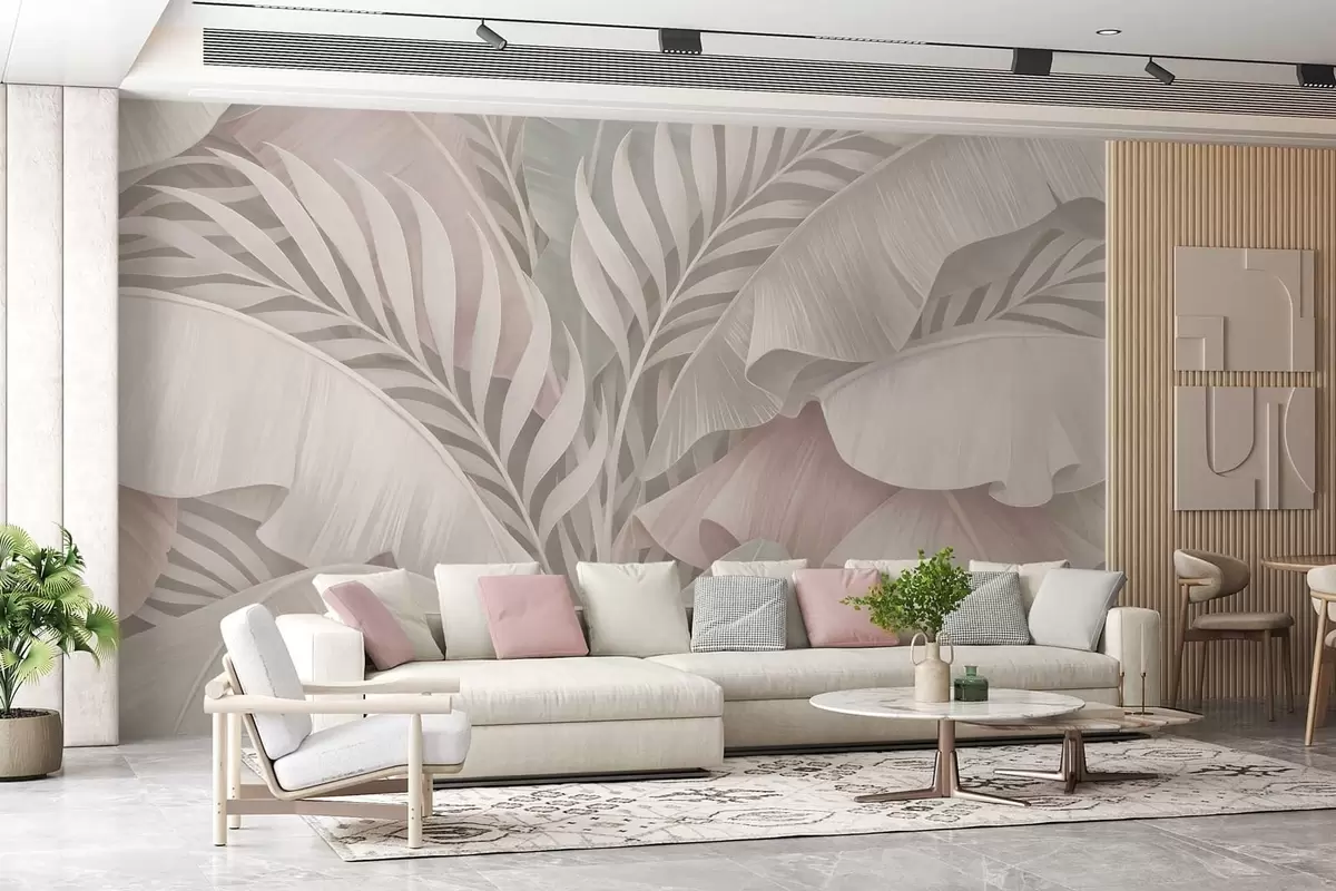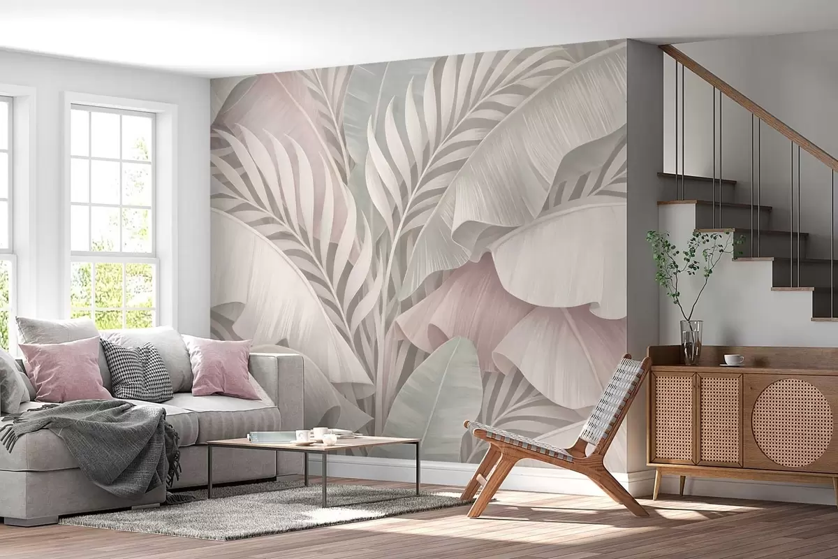Papier peint grandes feuilles tropicales dans des tons frais de rose et de gris N° w05062v1