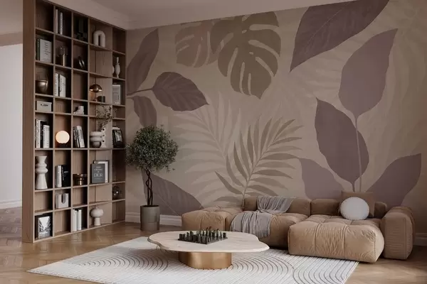 Papier peint feuilles tropicales texturées sur fond sableux N° w05063