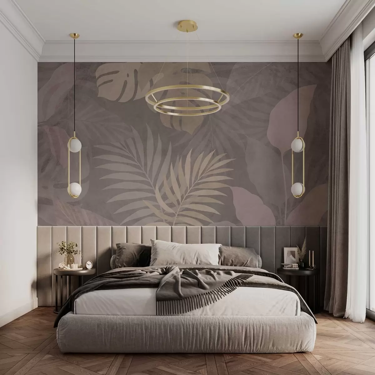 Papier peint feuilles tropicales texturées sur fond gris N° w05063v1