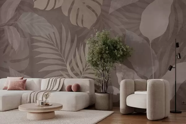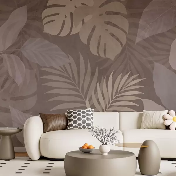 Papier peint feuilles tropicales texturées sur fond chocolat N° w05063v2