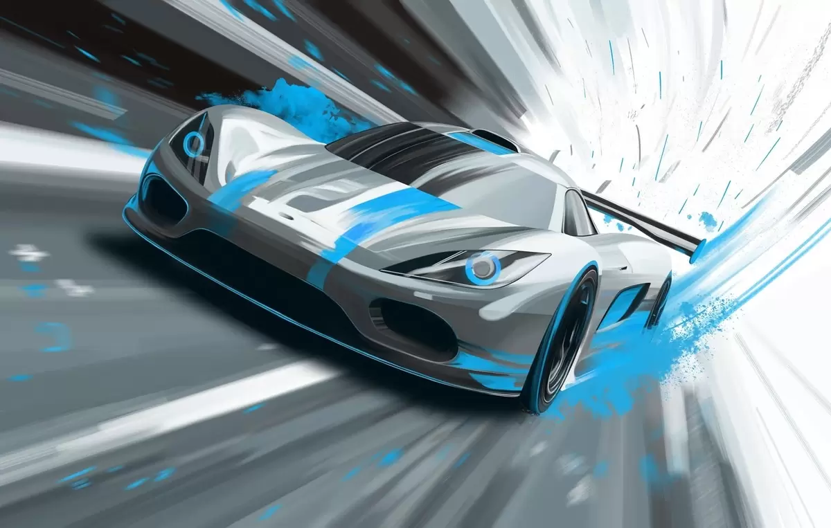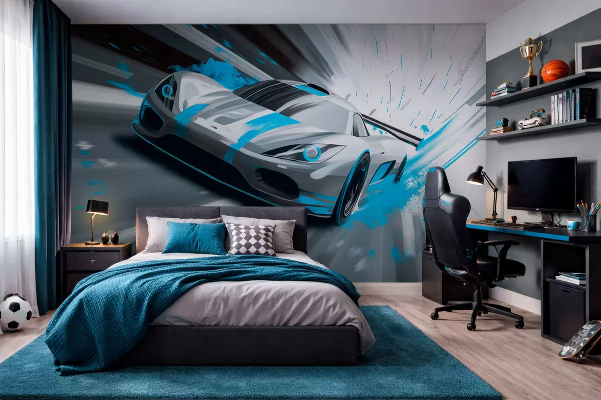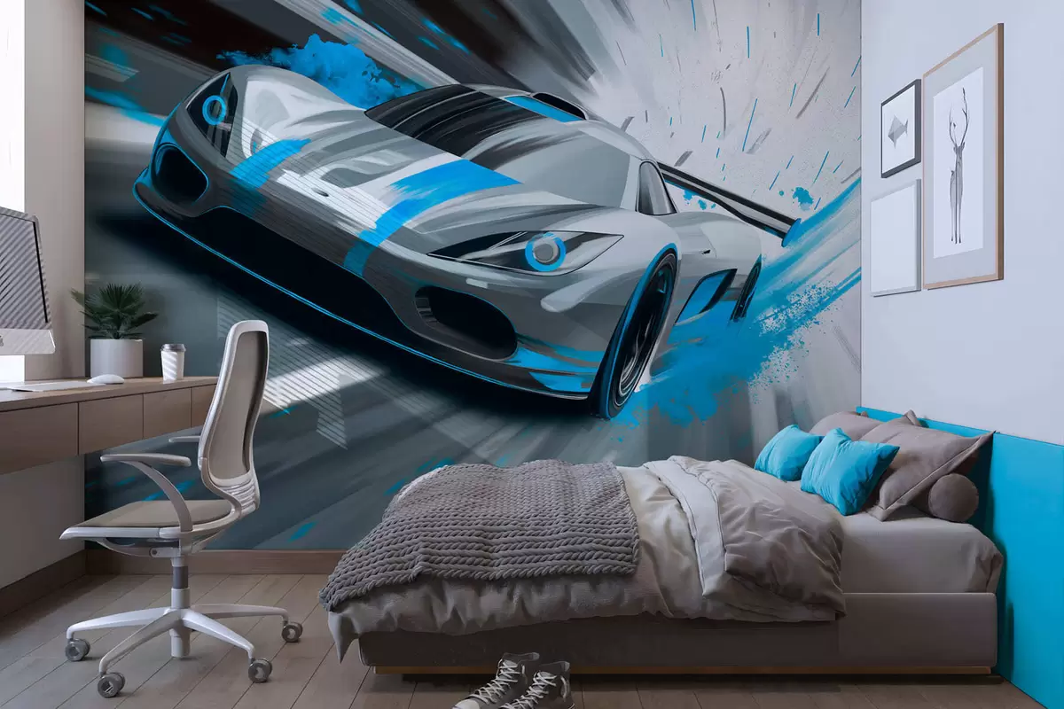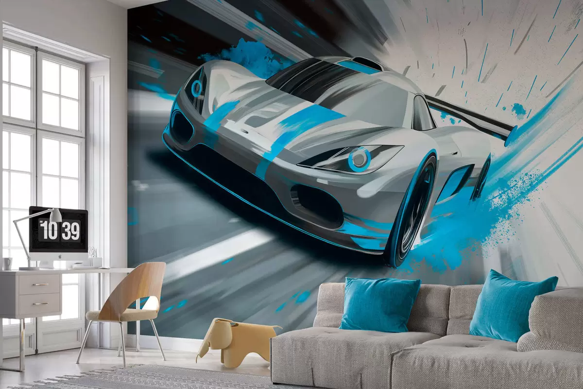 Papier peint voiture de sport dynamique dans un style de dessin numérique avec des accents turquoise N° w05069v3