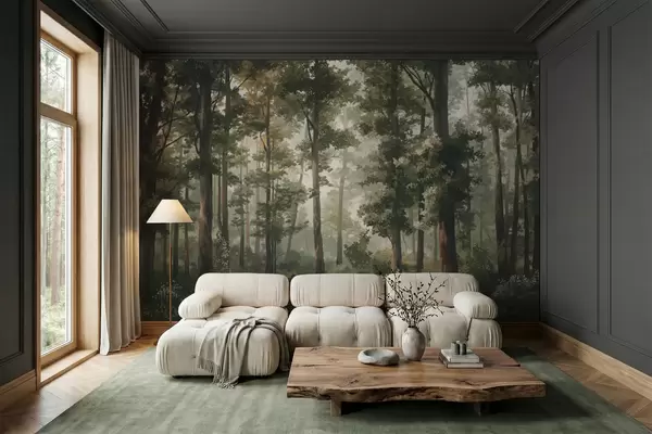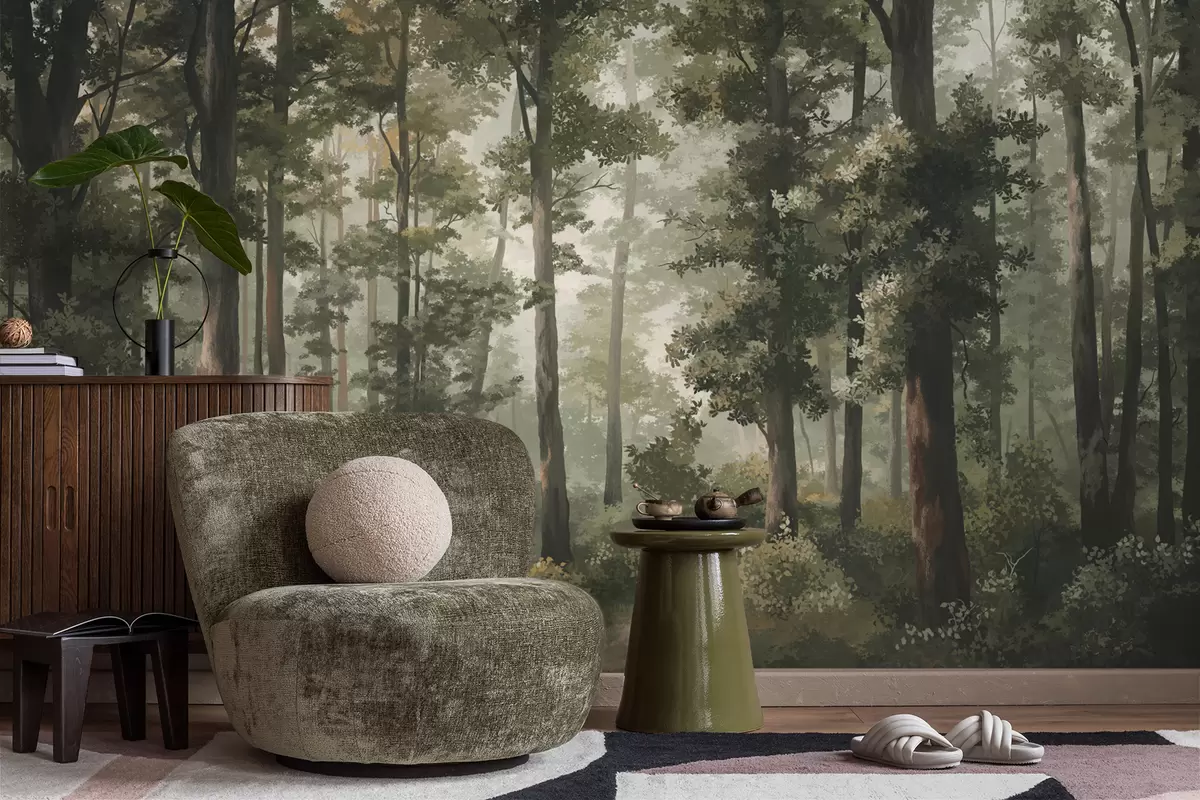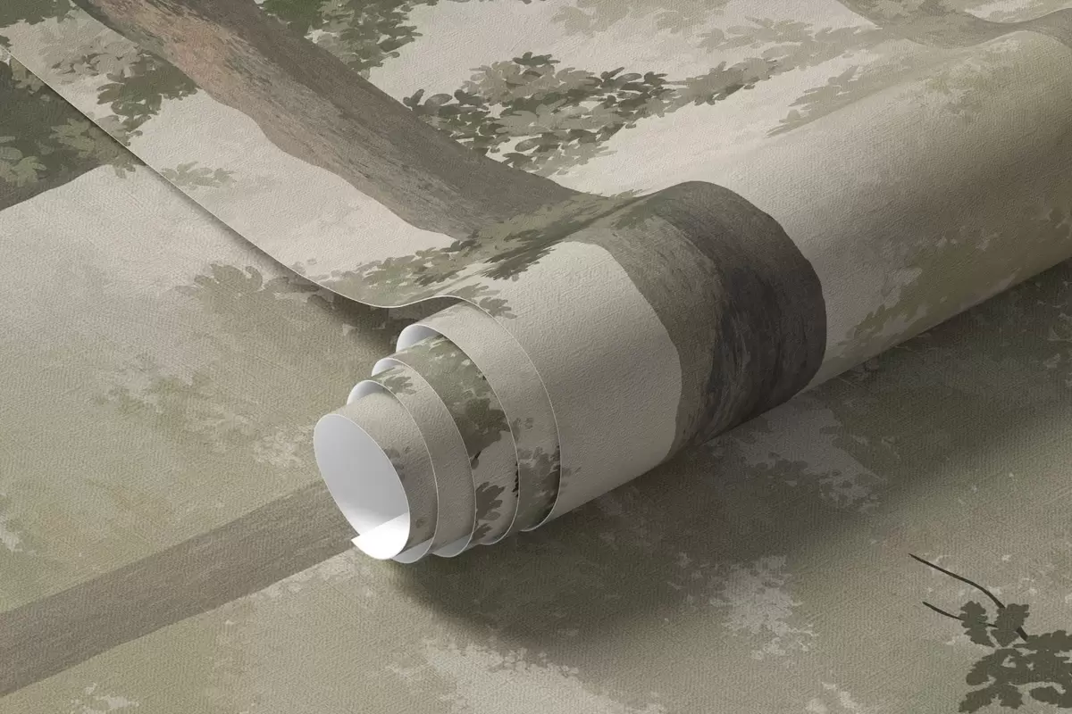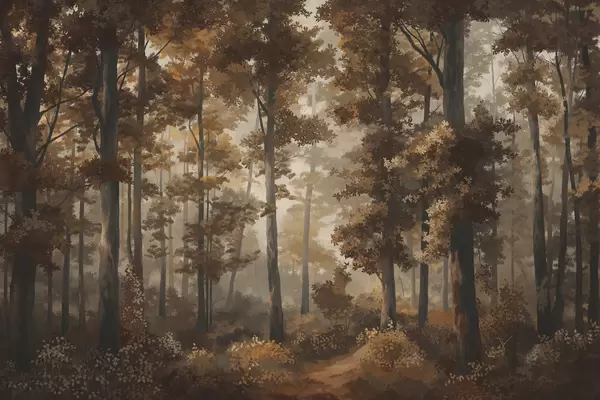 Papier peint Illustration forestière avec brume, grands arbres et sentier N° w05089