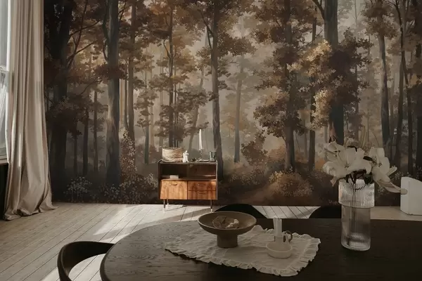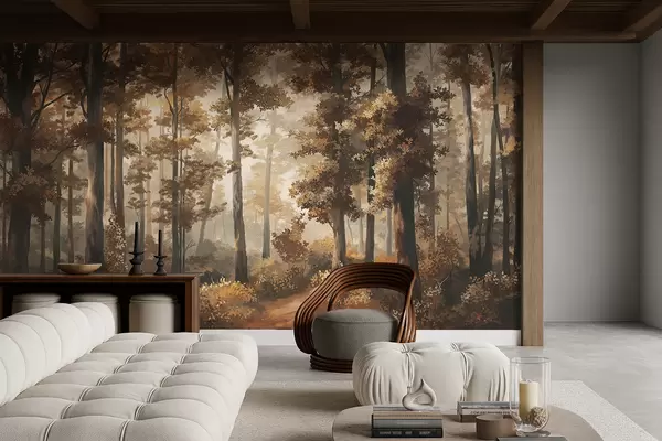Papier peint Scène automnale dans la forêt avec une lumière chaude et des arbres denses N° w05089v1