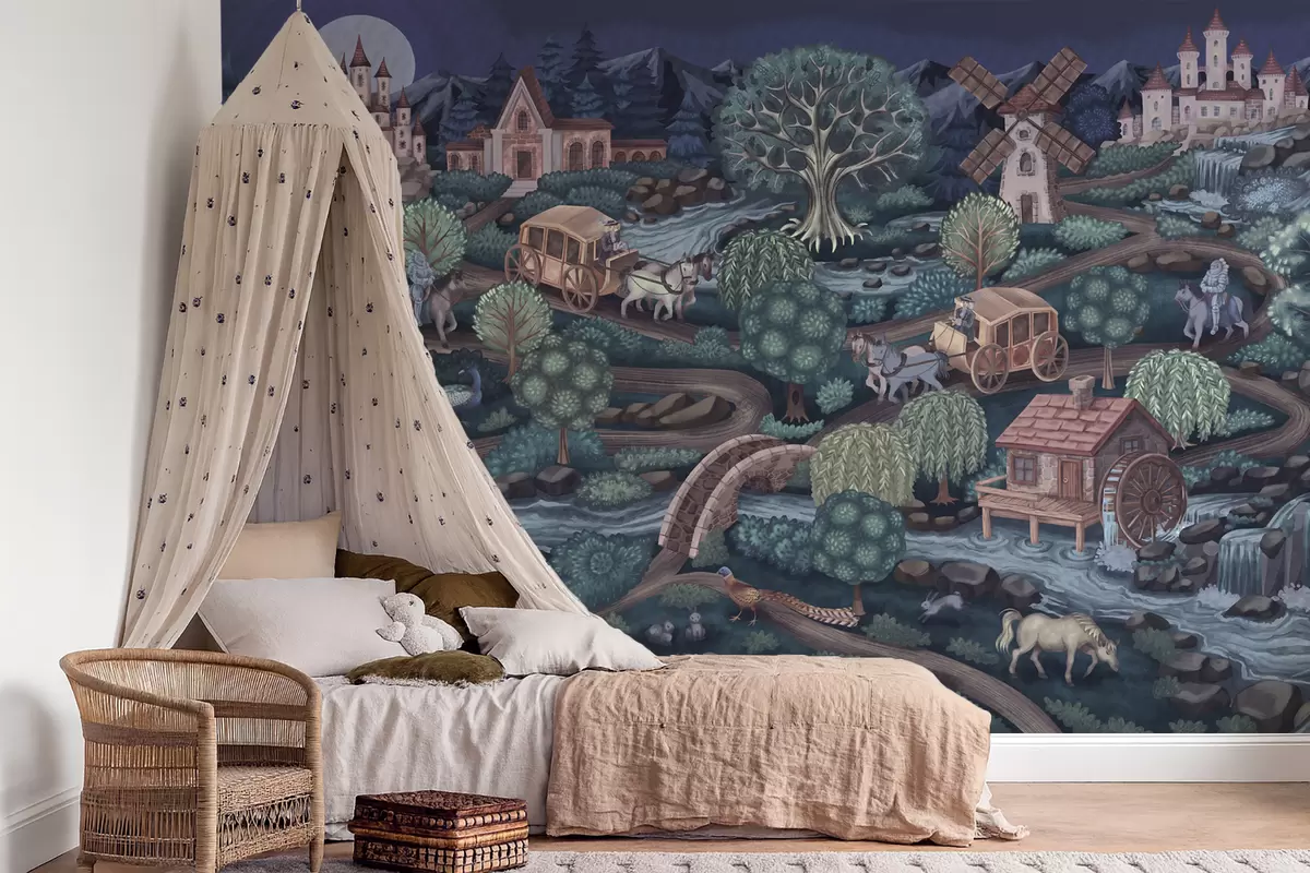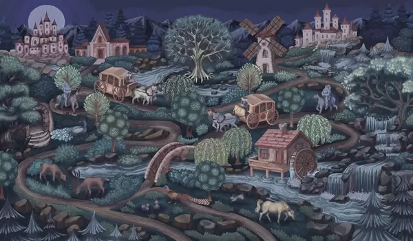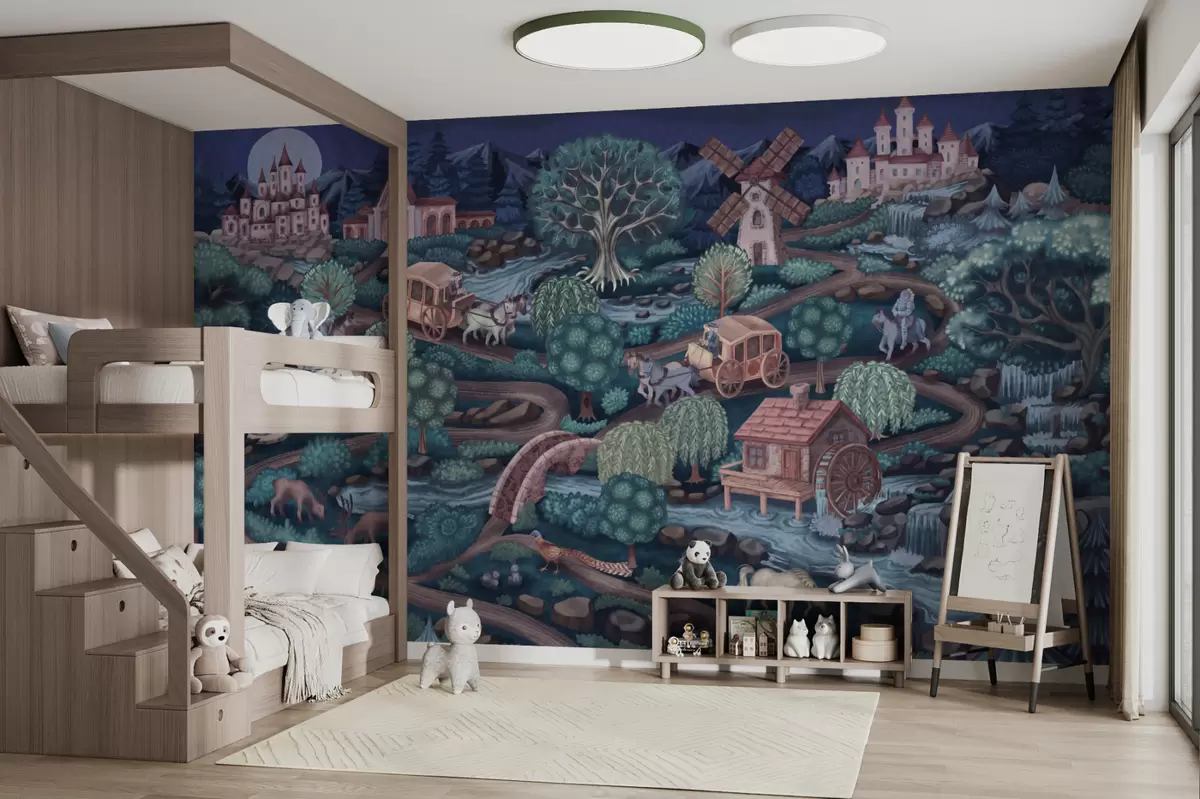 Papier peint Scène féérique nocturne avec châteaux, moulins et forêt N° w05091