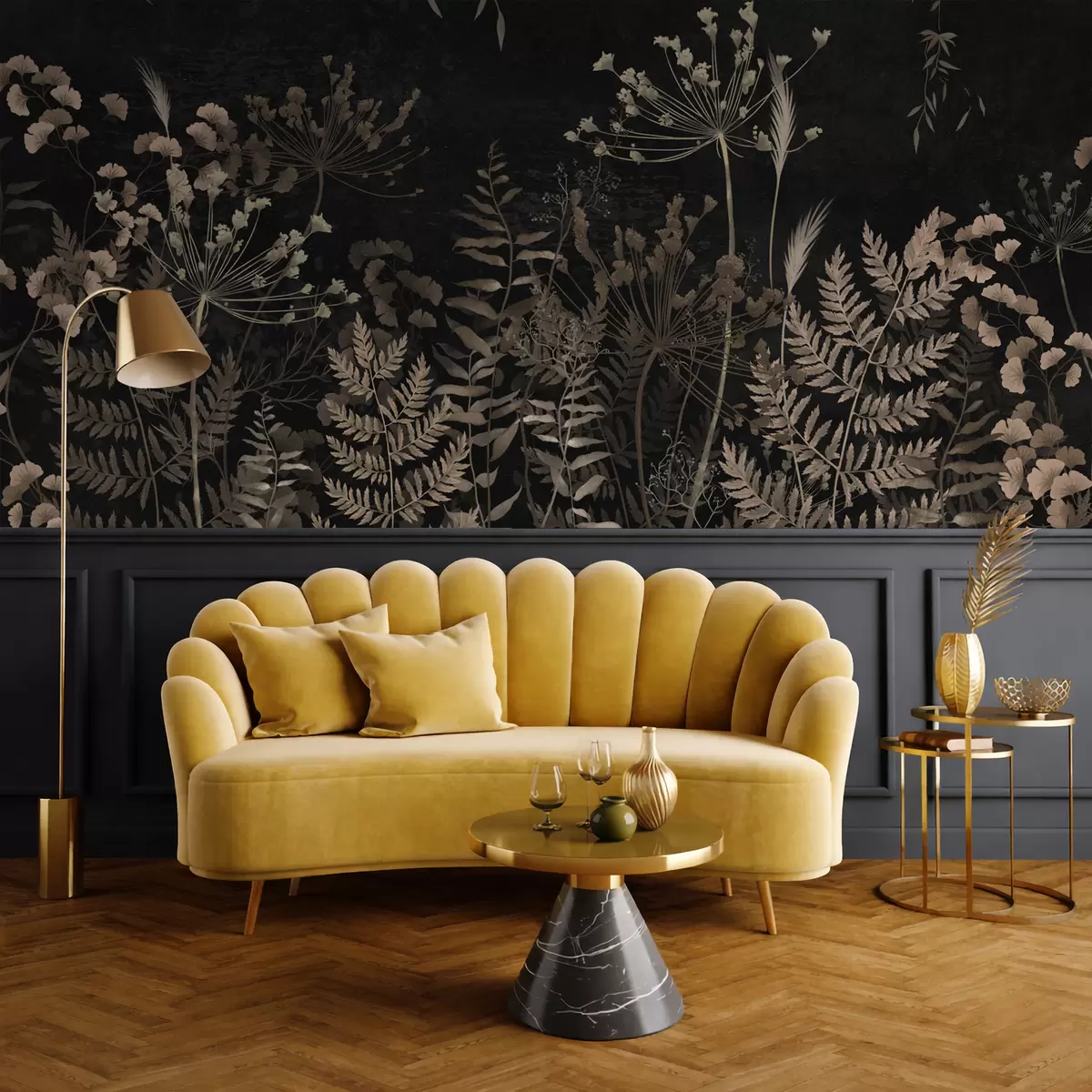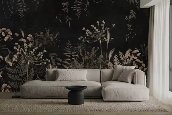 Papier peint Motif botanique sombre avec des fleurs et des feuilles N° w05092