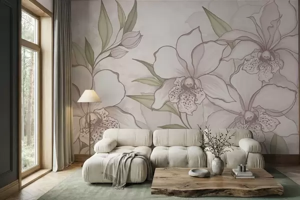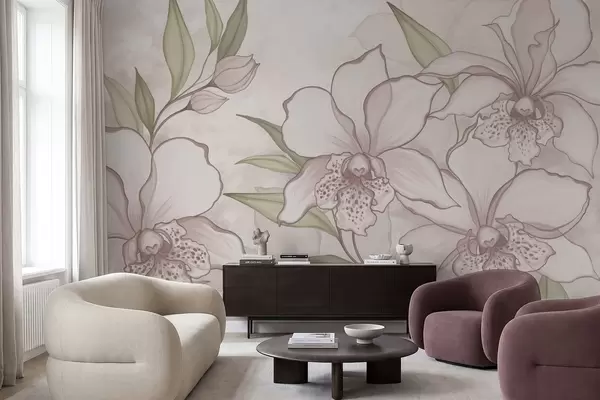Papier peint Illustration d'orchidées pâles avec des feuilles sur fond beige N° w05117