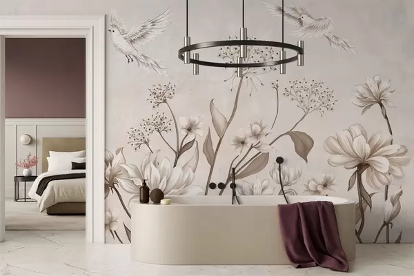 Papier peint Des fleurs et des oiseaux délicats sur un fond doux N° w05118