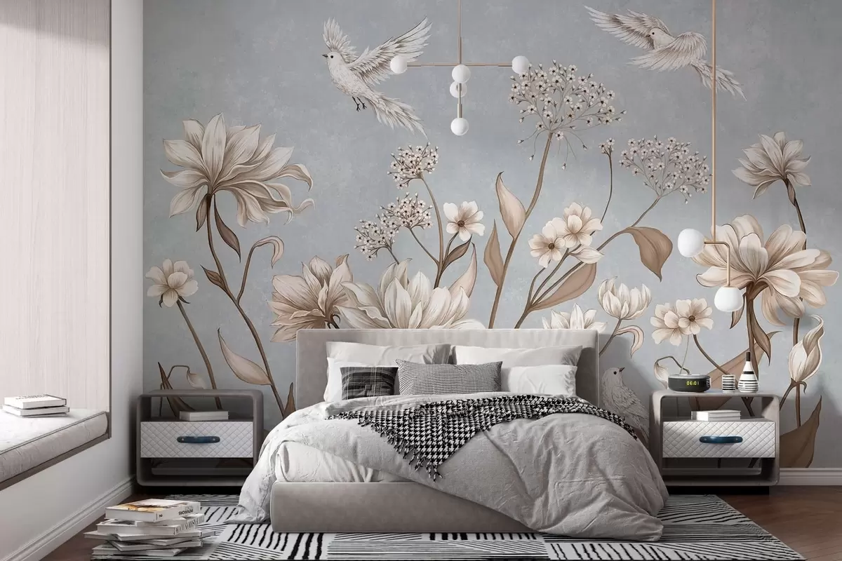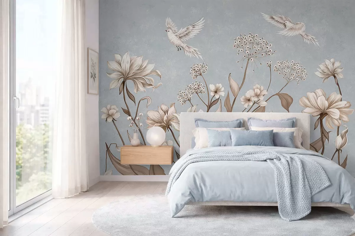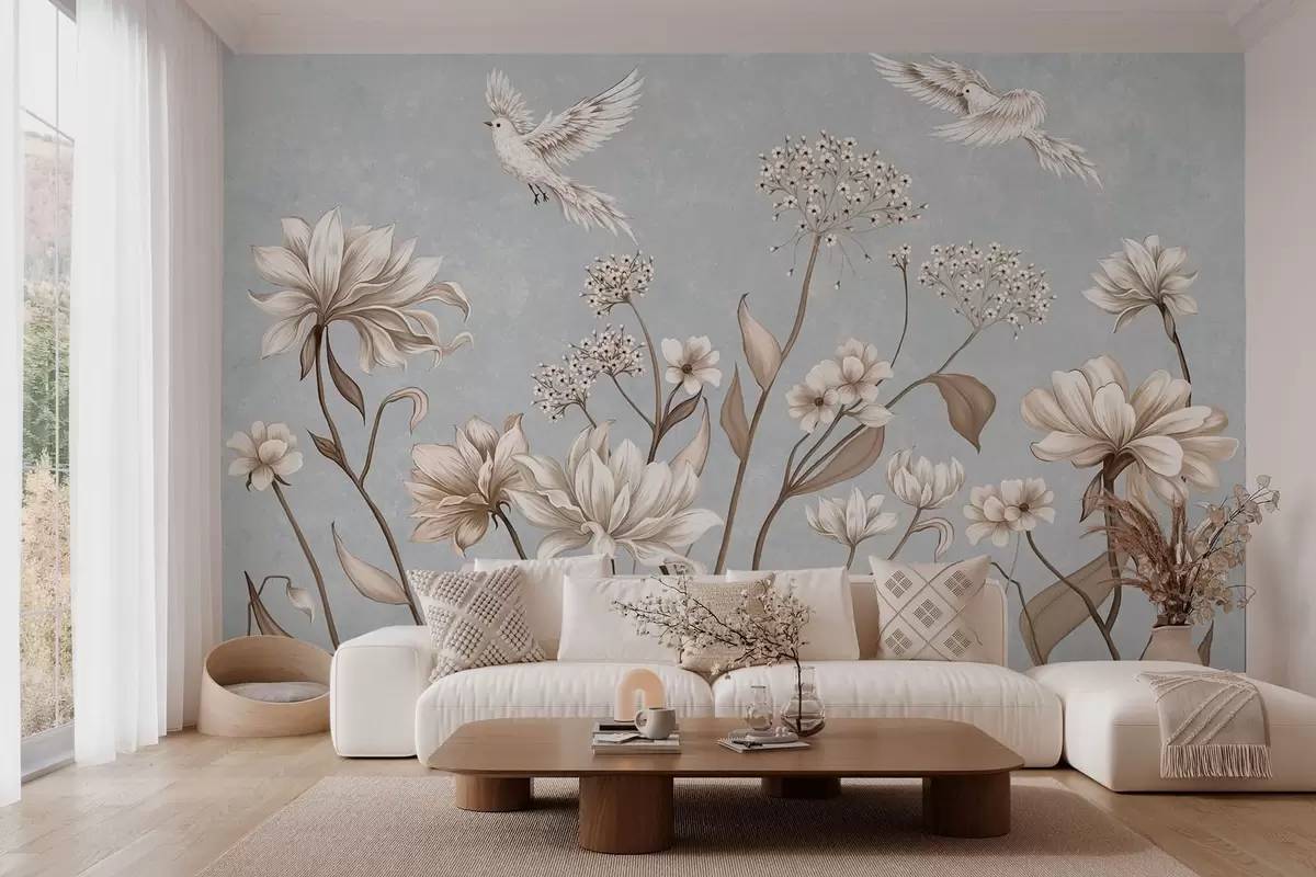 Papier peint Des fleurs et des oiseaux sur un fond gris-bleu frais N° w05118v2
