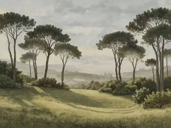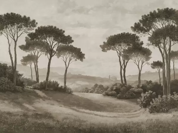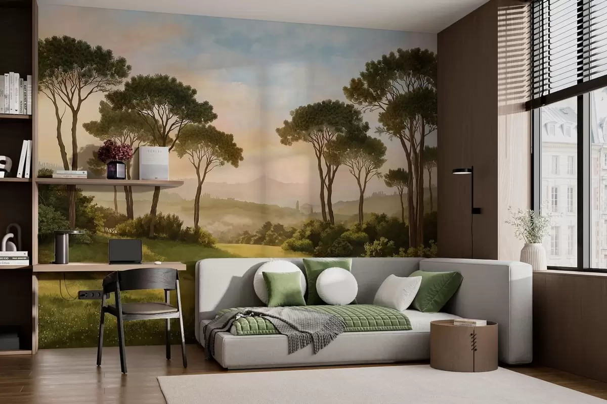 Papier peint Paysage avec des arbres baignés dans la lumière chaude du coucher de soleil N° w05122