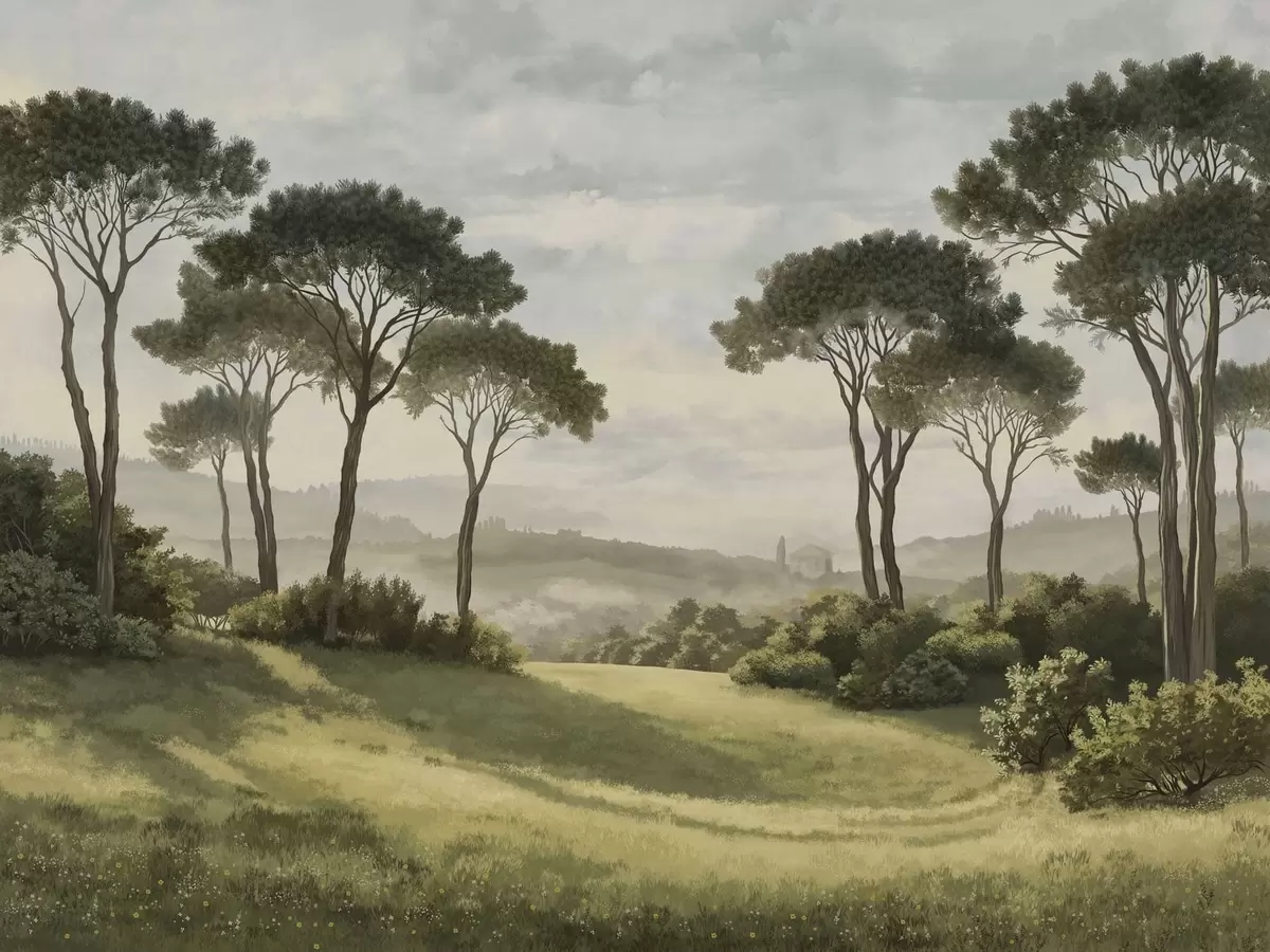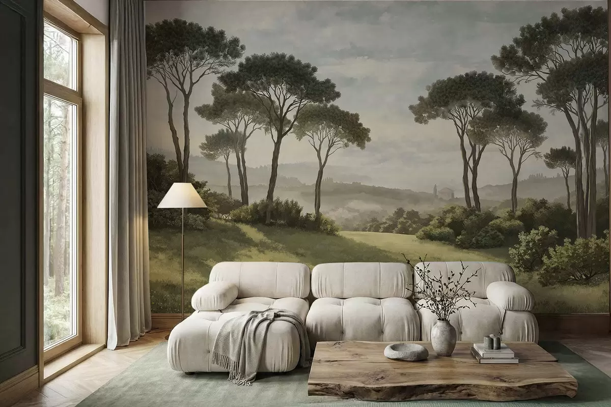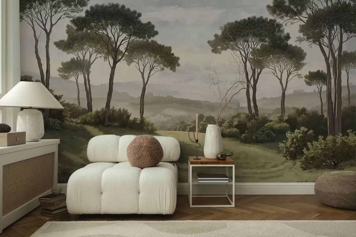 Papier peint Paysage avec des arbres, une prairie et de la brume au loin N° w05122v1