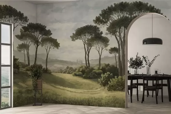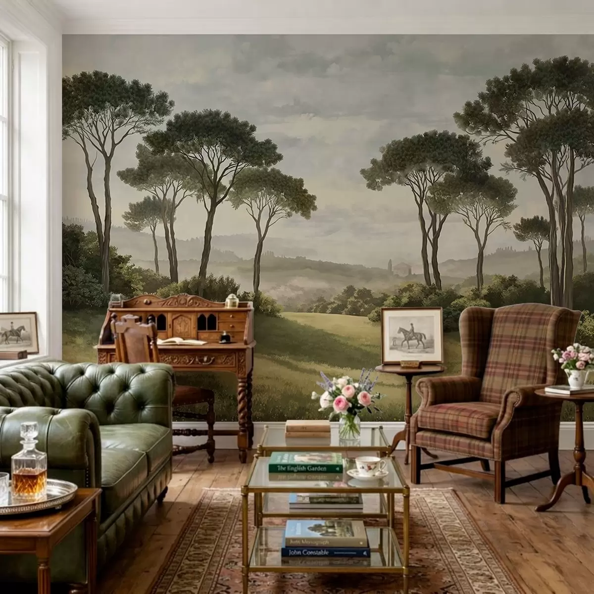 Papier peint Paysage avec des arbres, une prairie et de la brume au loin N° w05122v1