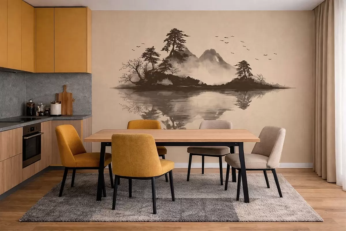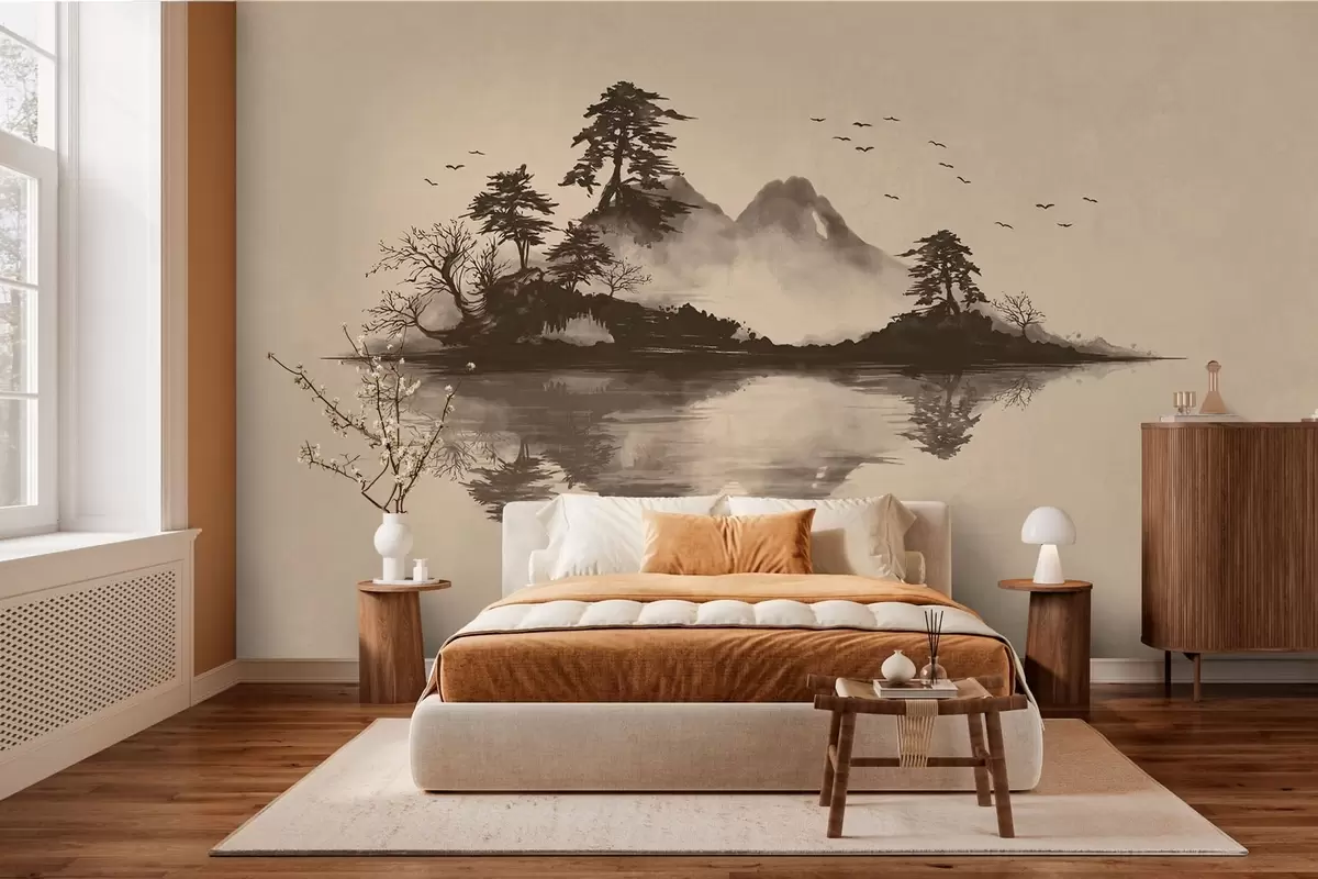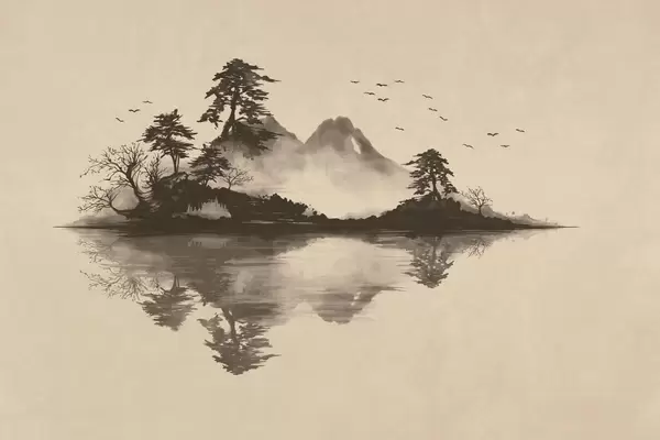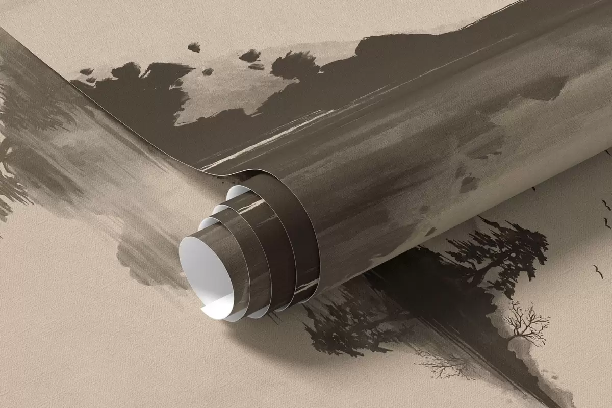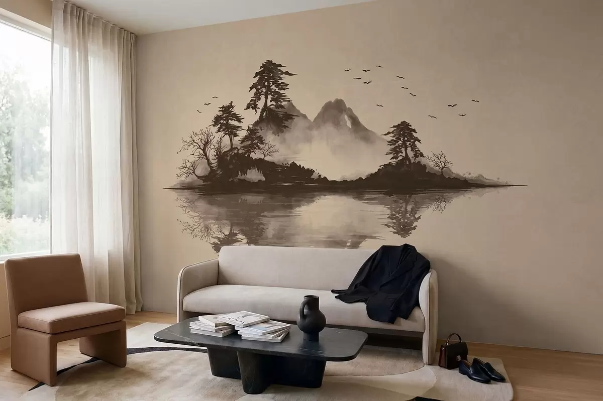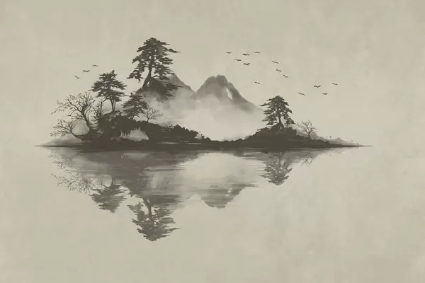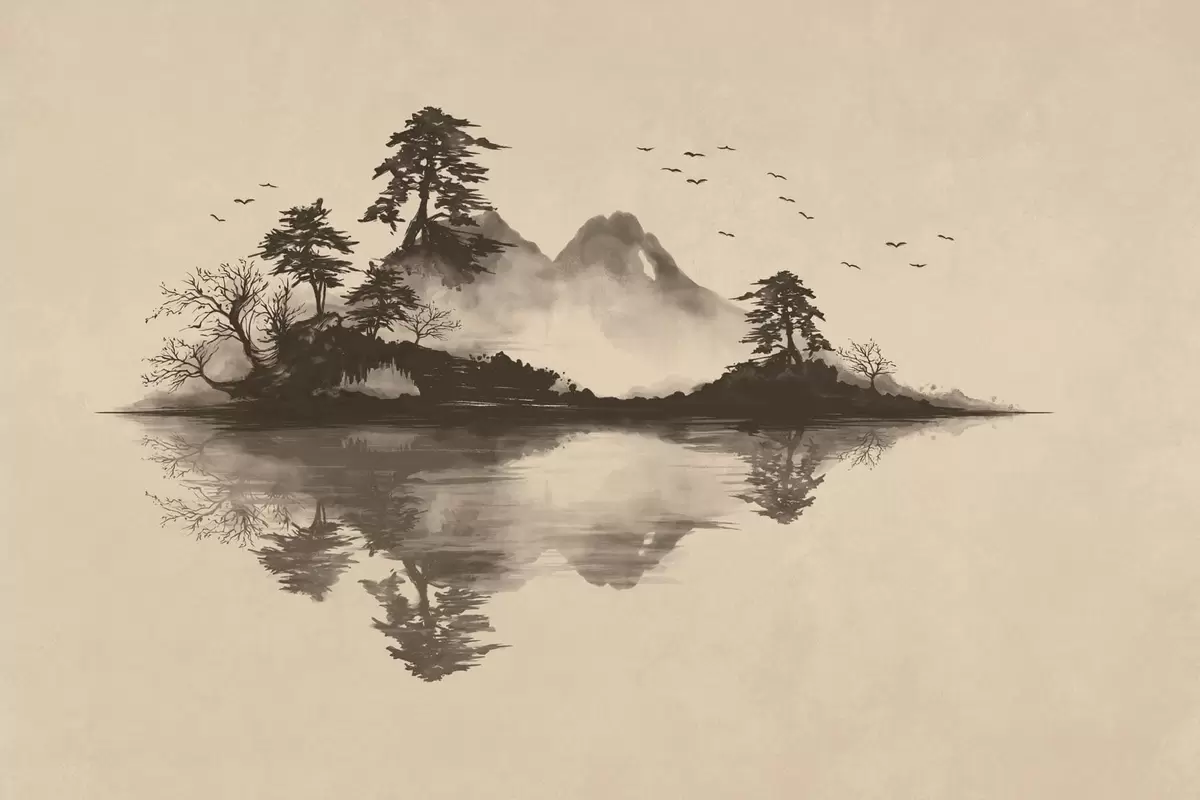 Papier peint Paysage de montagne au sumi-e avec des pins et un reflet N° w05124