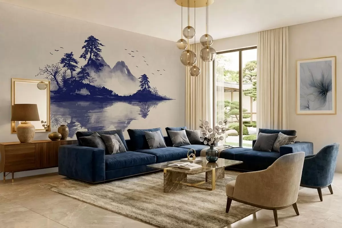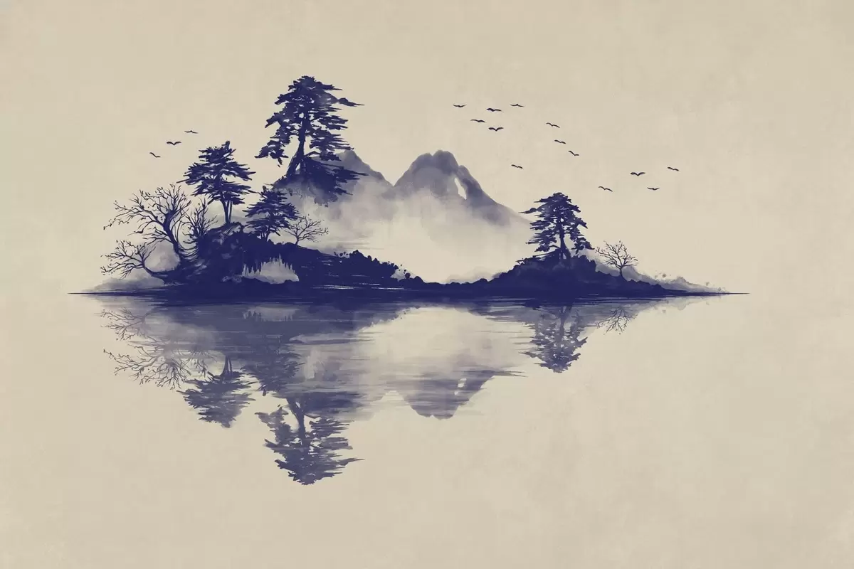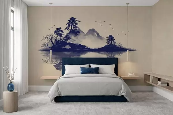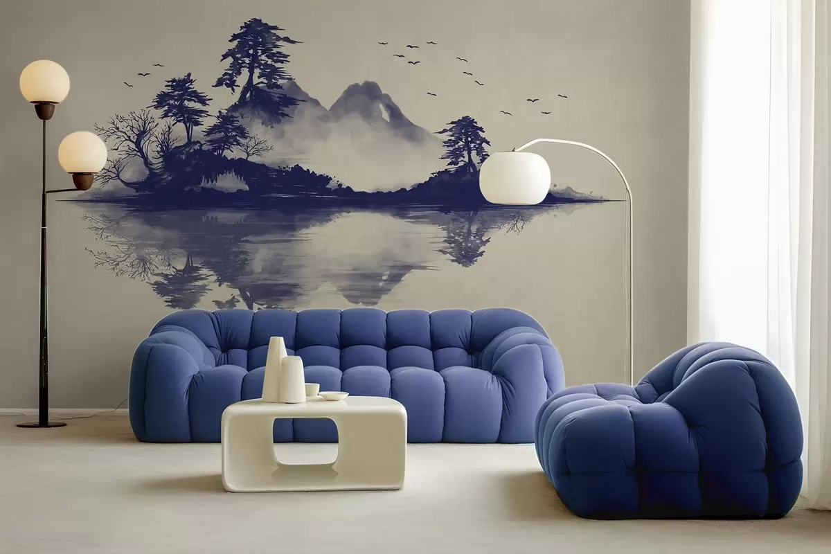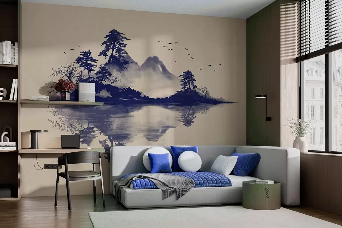 Papier peint Paysage de montagne en sumi-e dans des tons bleus N° w05124v2