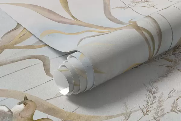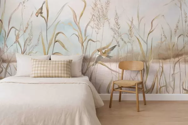 Papier peint Illustration de roseaux et d'oiseaux au bord de l'eau dans des tons doux N° w05125