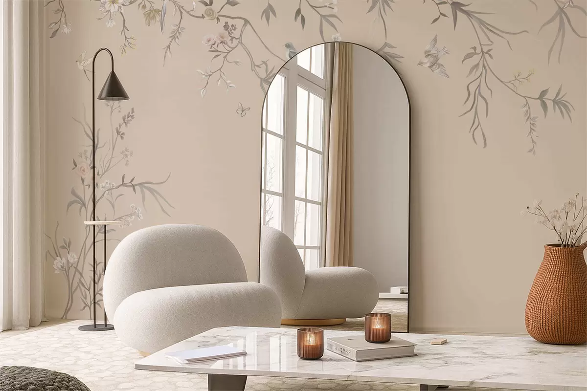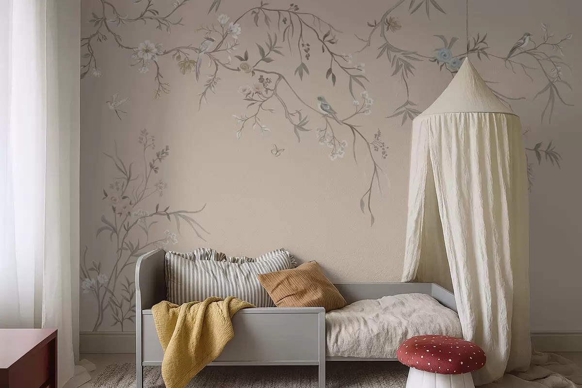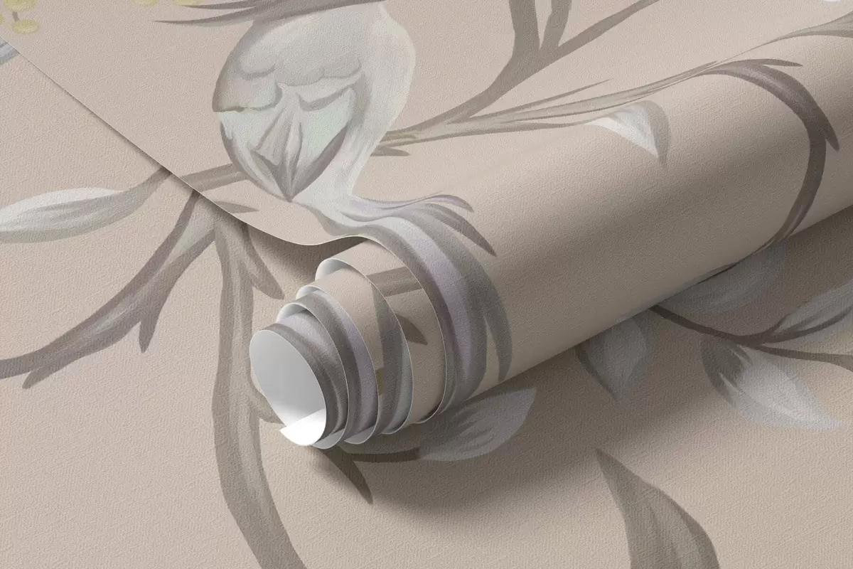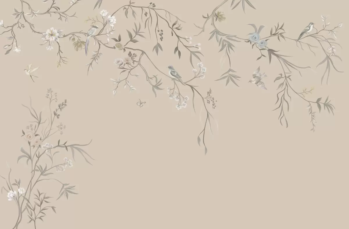 Papier peint Branches fleuries avec des oiseaux sur fond beige chaud N° w05127v1