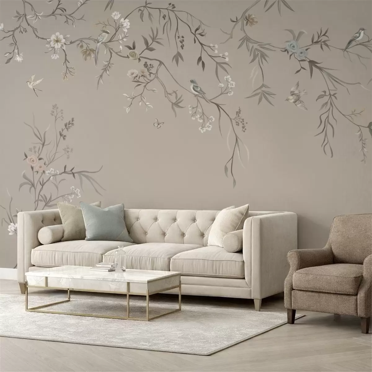 Papier peint Ornement floral avec des oiseaux sur fond neutre N° w05127v3