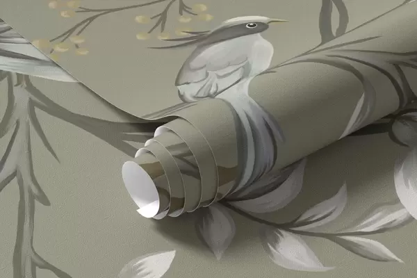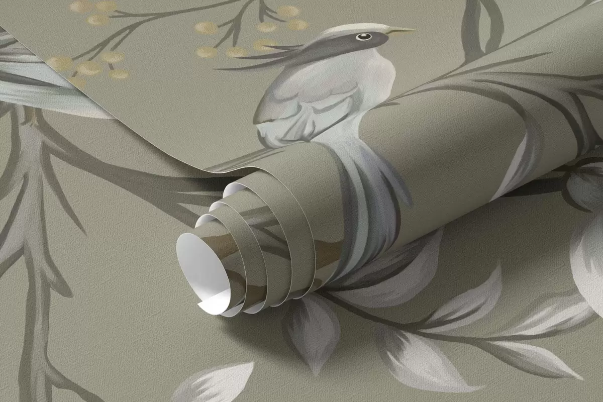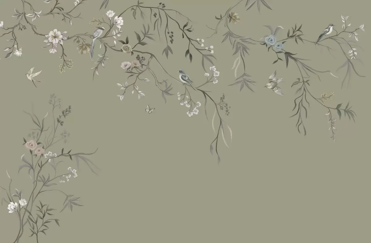 Papier peint Motif floral avec des oiseaux sur fond gris N° w05127v4