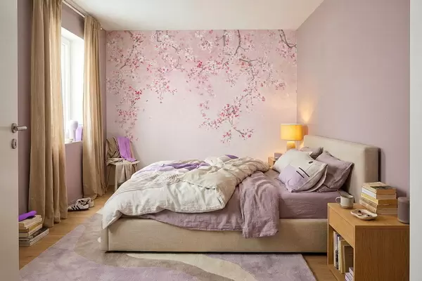 Papier peint Branches avec des fleurs roses sur un fond pastel doux N° w05129v1