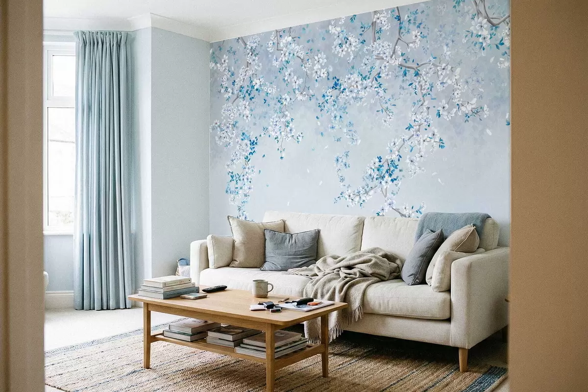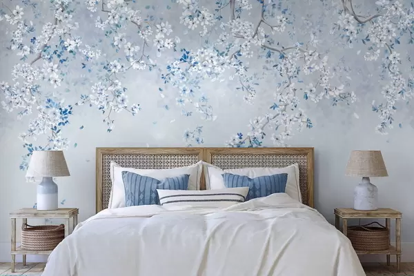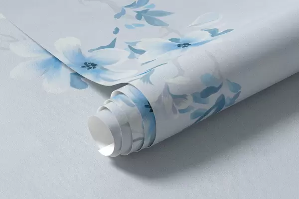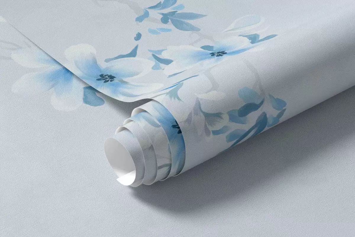 Papier peint Branches avec des fleurs blanches et bleues sur un fond frais N° w05129v2