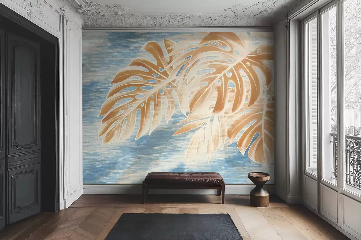 Papier peint Feuilles dans des tons sable clairs sur fond bleu N° w05130v1