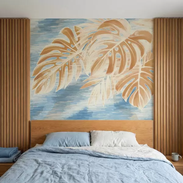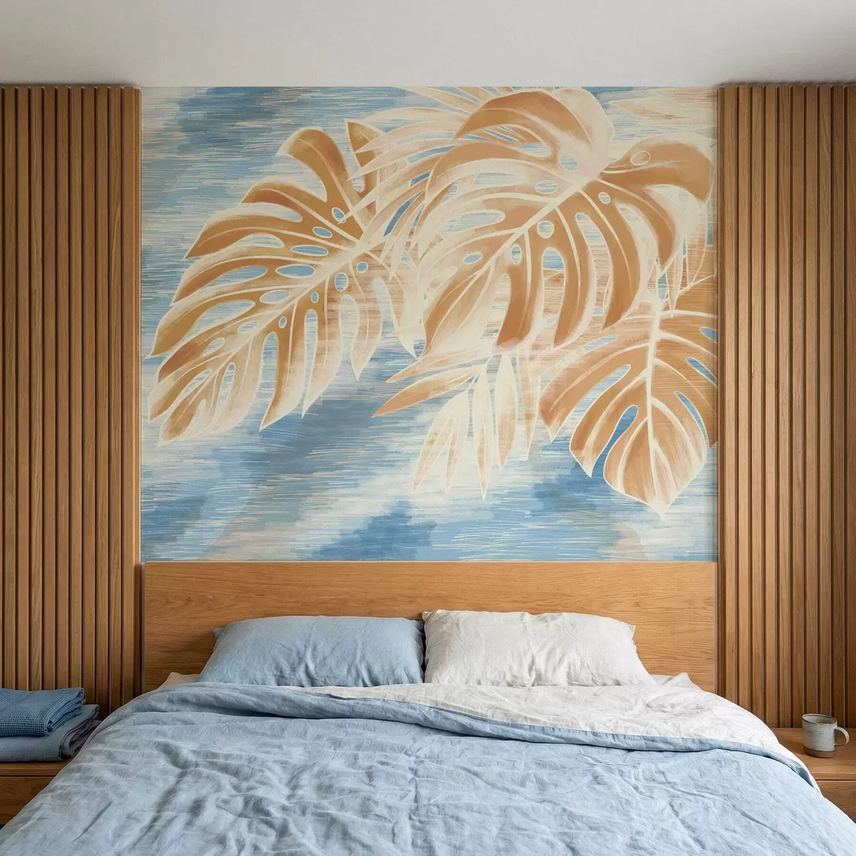 Papier peint Feuilles dans des tons sable clairs sur fond bleu N° w05130v1