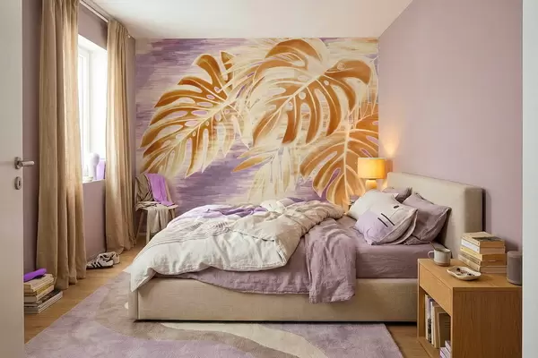 Papier peint Feuilles dans des tons orange chauds sur fond violet N° w05130v2