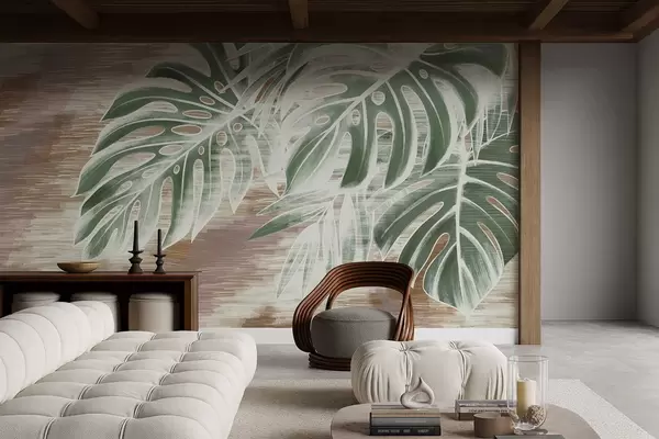 Papier peint Feuilles vertes sur un fond abstrait à la texture chaleureuse N° w05130v3