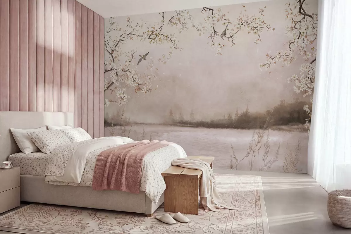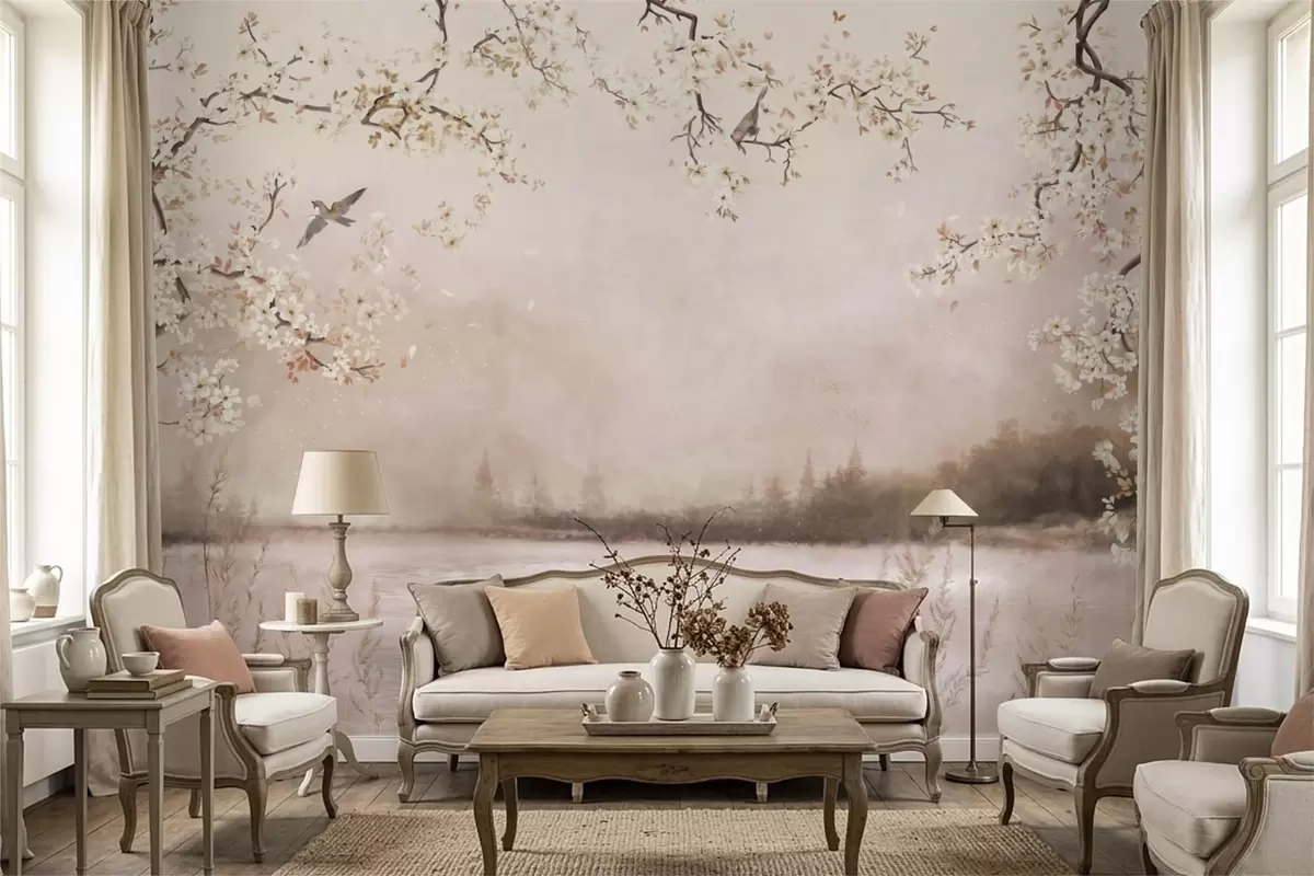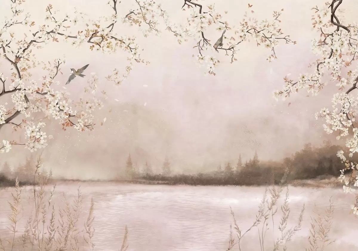 Papier peint Branches fleuries au-dessus d'un lac calme avec des oiseaux dans la brume N° w05155v1